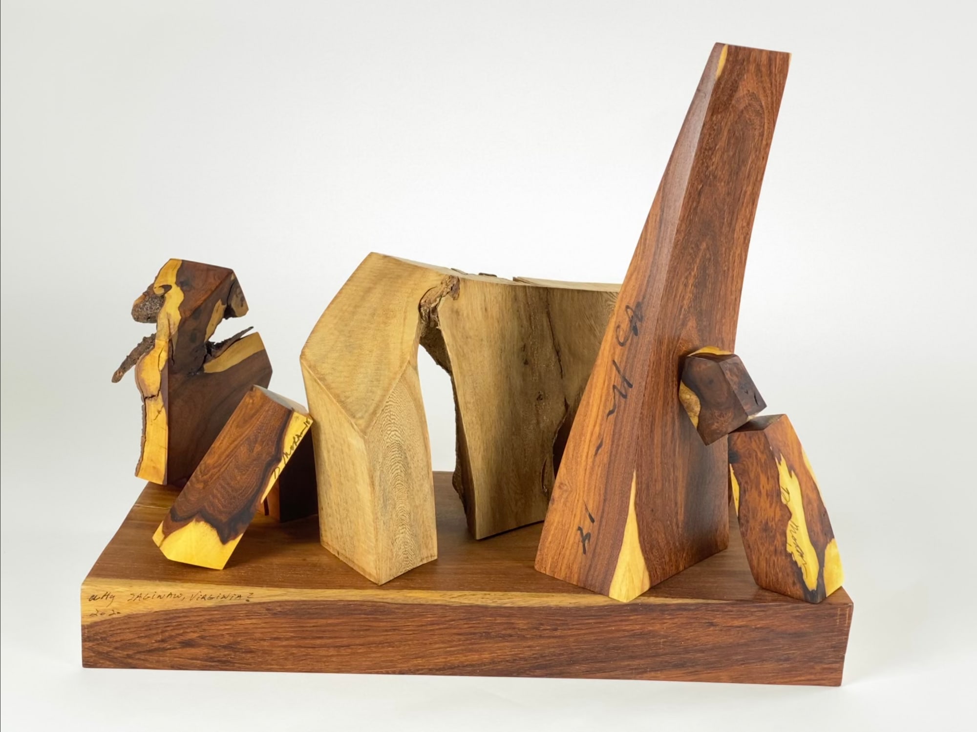 Wooden sculpture of multiple pieces. East Indian rosewood, East Indian fig, avocado, cedar.