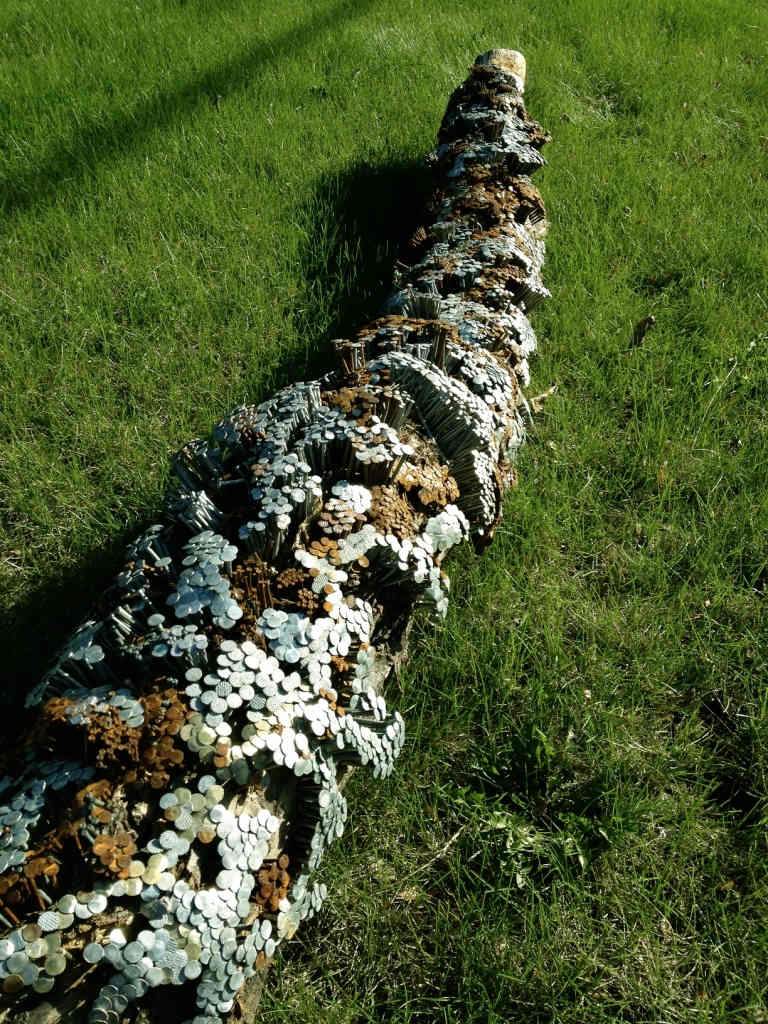 First, a correction. Most folks mistakenly think that they are comprised of nails pounded into logs. That is just the meat level of their existence. They are, in actuality, comprised of prayer and meditation. For each nail pounded into a log either a prayer, an affirmation, or my sanskrit mediation mantra is uttered, either silently or aloud. (Initiated and trained by a hindu teacher, Swami Venketesananda, in 1969 I have been meditating daily for 55+ years now. Meditation is the core base of my life. Without it I have no doubt I would be dead.) When I pound the nails into logs (pine preferably, and knotty to prevent splitting) I move into a no mind space, a spaciousness where thoughts, if they arise, simply pass thru my mind but do not settle there nor attract focus or even attention. Thus, I sit in a peaceful emptiness for much of the time I am nail pounding (usually 30-45 minutes a session). I DO NOT make aesthetic decisions while nail pounding these sculptures, that part of my mind is not active. All placement decisions are made intuitively in concert with my hands. And having been in the construction trades for 15 years (or more) including time spent doing carpentry, my hands are very talented. There is a flow to all this… and it happens pretty much on its own.