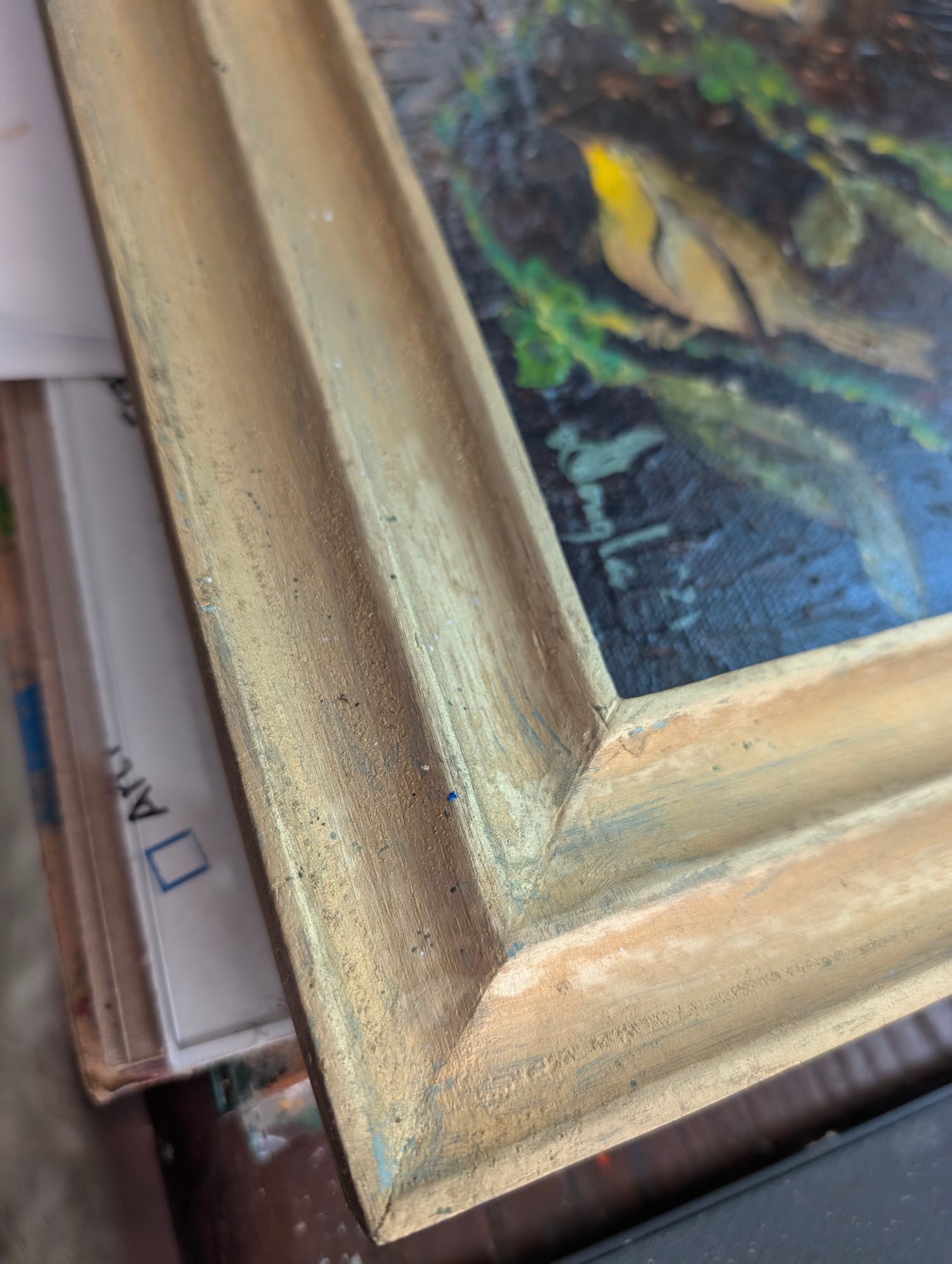 Framed in shabby-chic plein air wood frame, weathered gold leaf look.