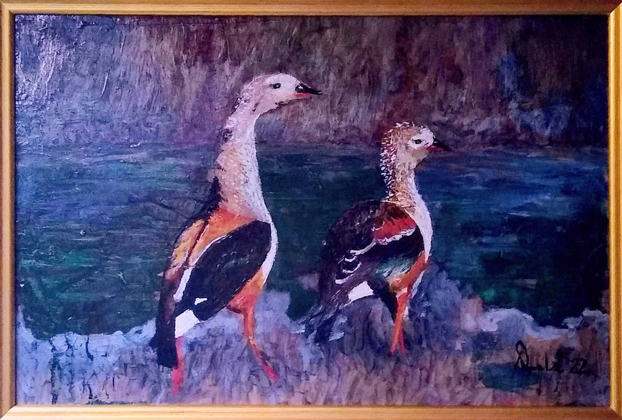 A male and female of the species linger near wetland. Dark background. Framed in wide, flared contemporary museum quality frame, hardwood with gold gilt-like finish.