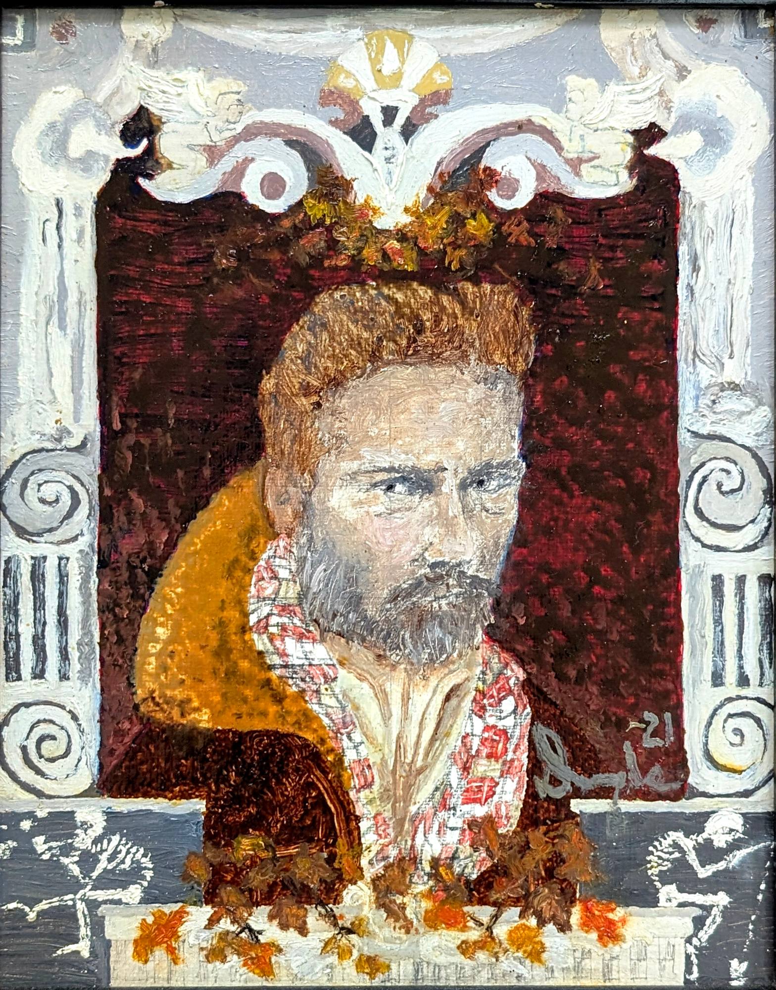 Framed in a vintage, heavy gothic frame, hardwood and gesso, roughly painted black.