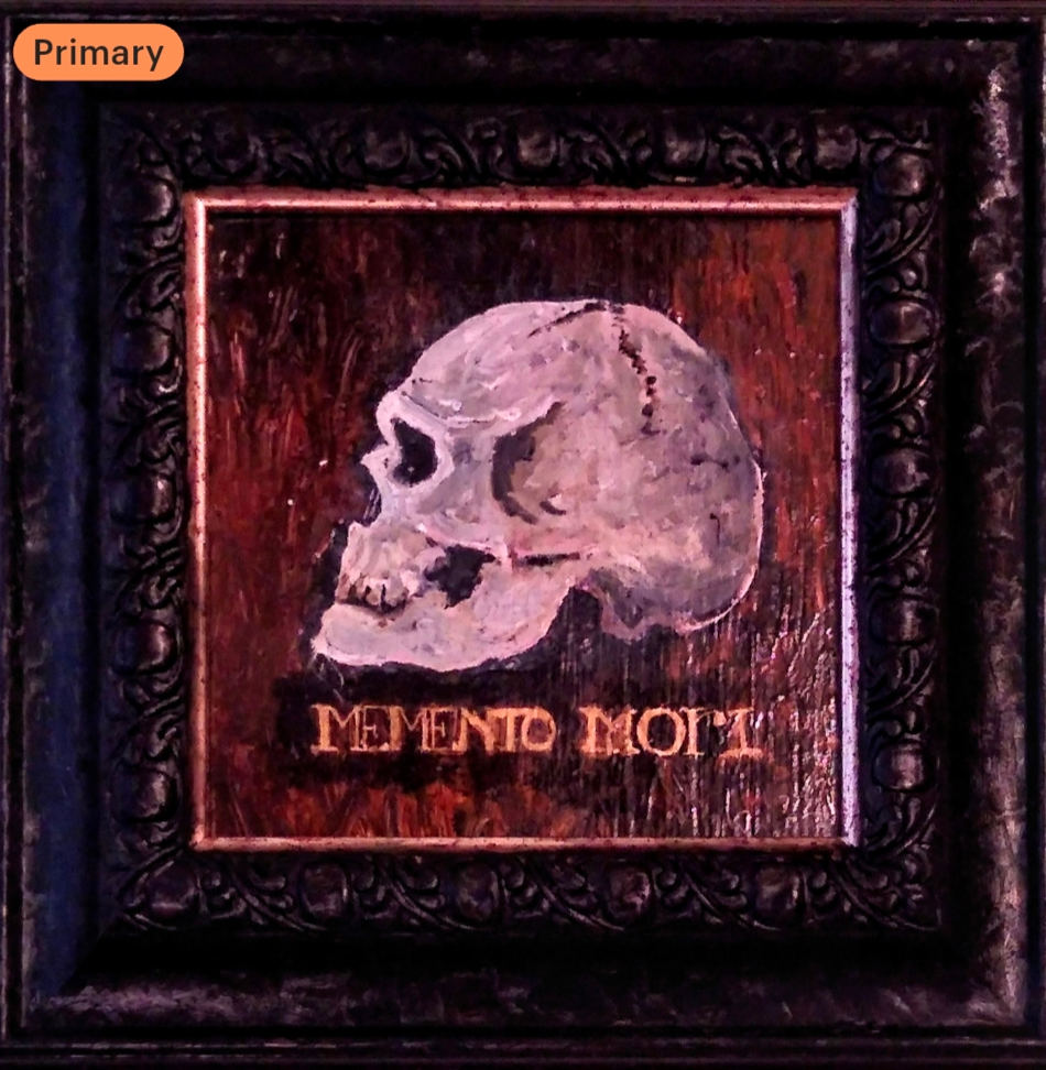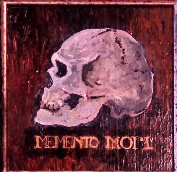 Skull in profile, the title MEMEMNTO MORI rendered with gold paint in an old world style below, framed in a substantial gothic frame.