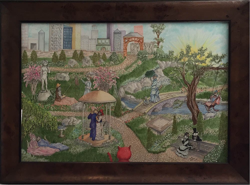 This piece was created in sections. 27 different interlocking pieces were created and glued into this poster-sized piece. A heavy wooden frame surrounds this park fantasy featuring figures from Classic Art masterpieces with cats replacing the people. Take a stroll with the Cats In The Park.