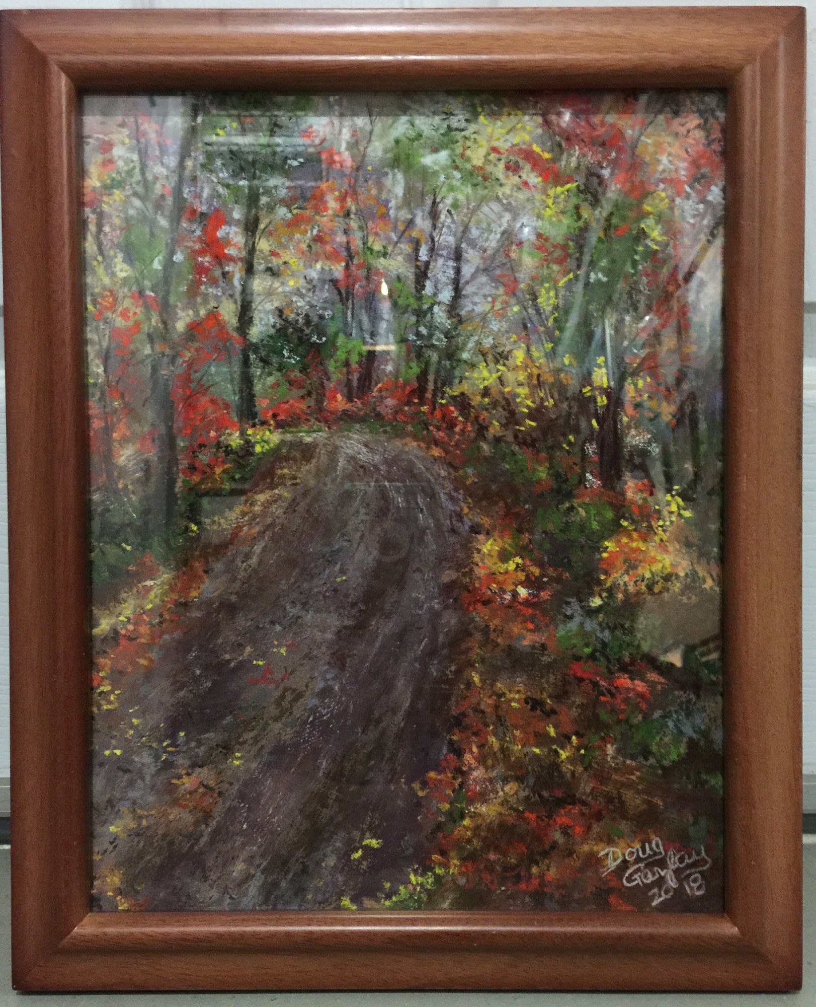 Painted from a summer scene, the colors were transposed into the beauty of fall. Pastels bring this fall scene from my brother's driveway entrance to life.