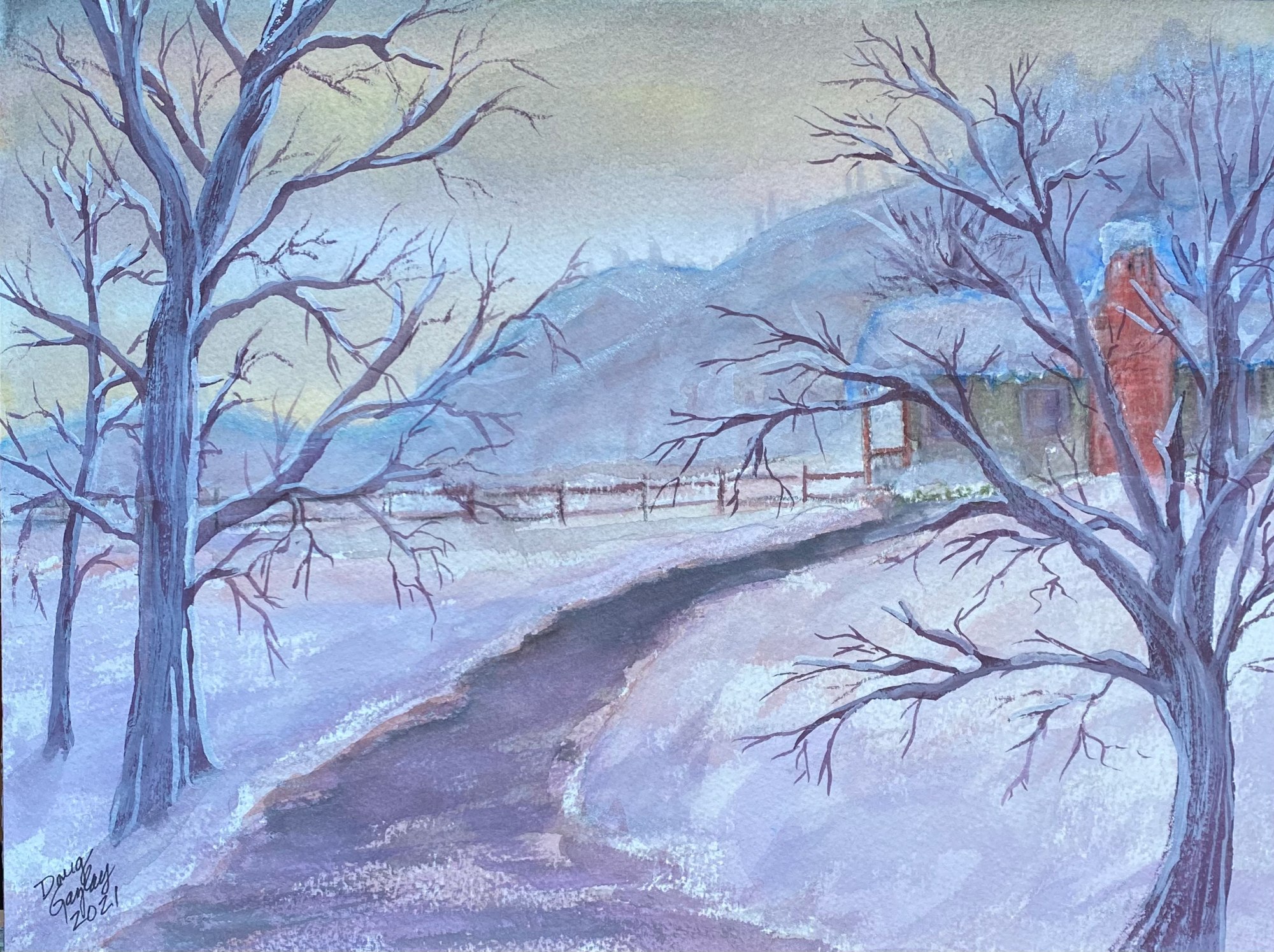 Watercolor & Watercolor pencil unframed winter scene on a farm