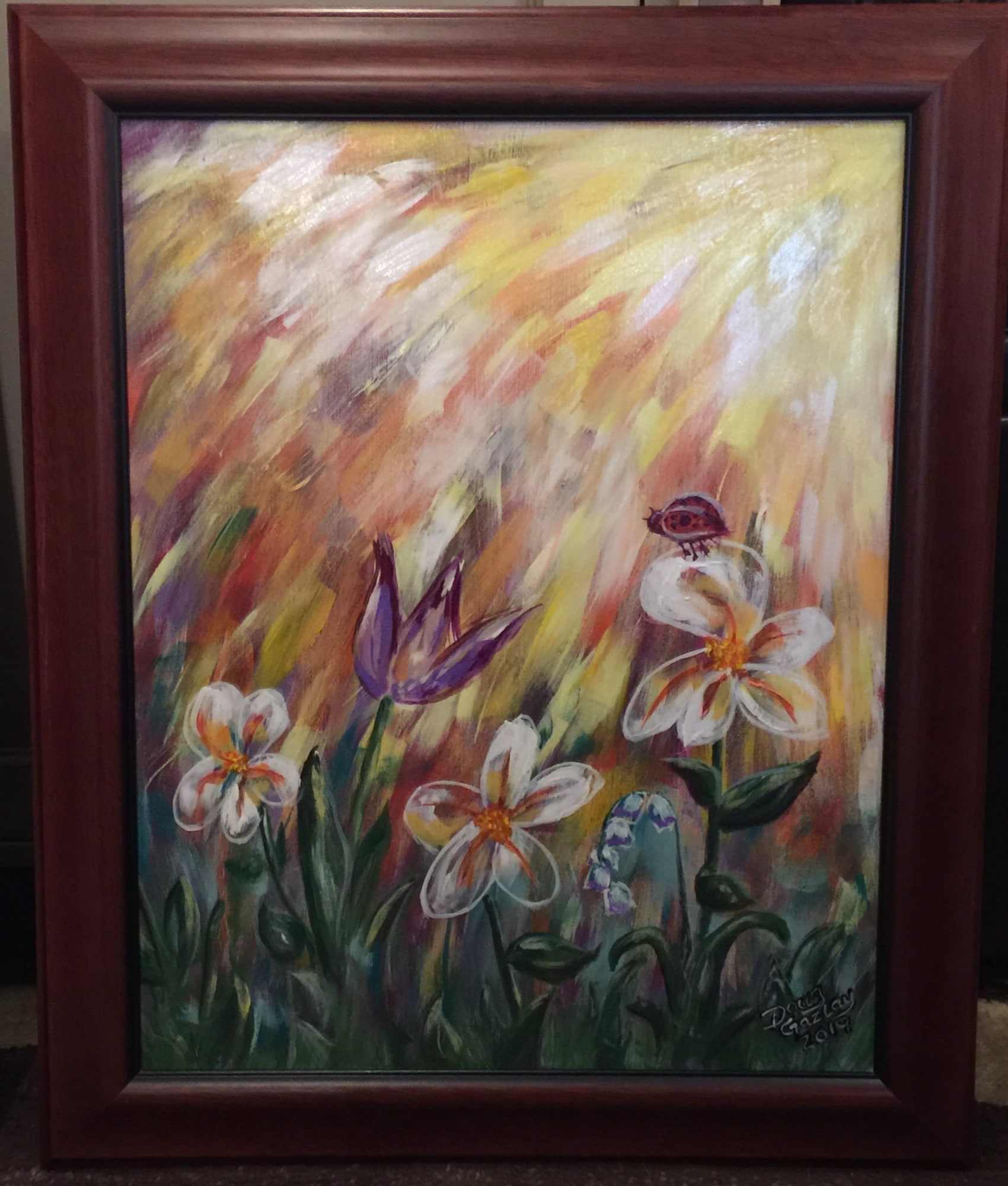 Whimsical interpretation of a sun drenched flower patch complete with a lady bug visitor.