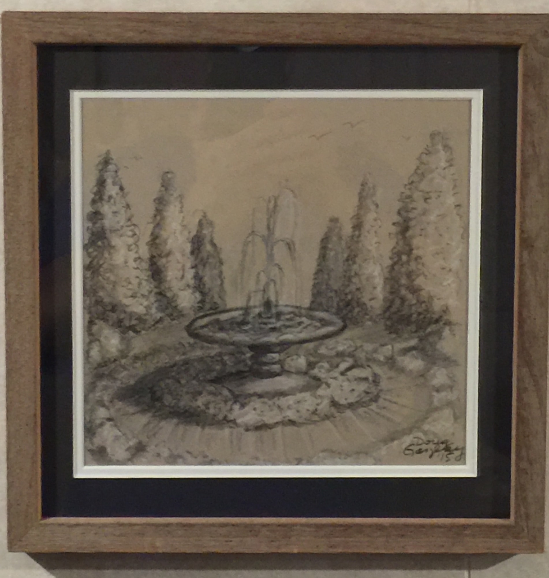 Charcoal drawing of a quaint, well-landscaped fountain area in the garden. Courtyard with a bubbling fountain featured in the center of the grove of Cypress.
