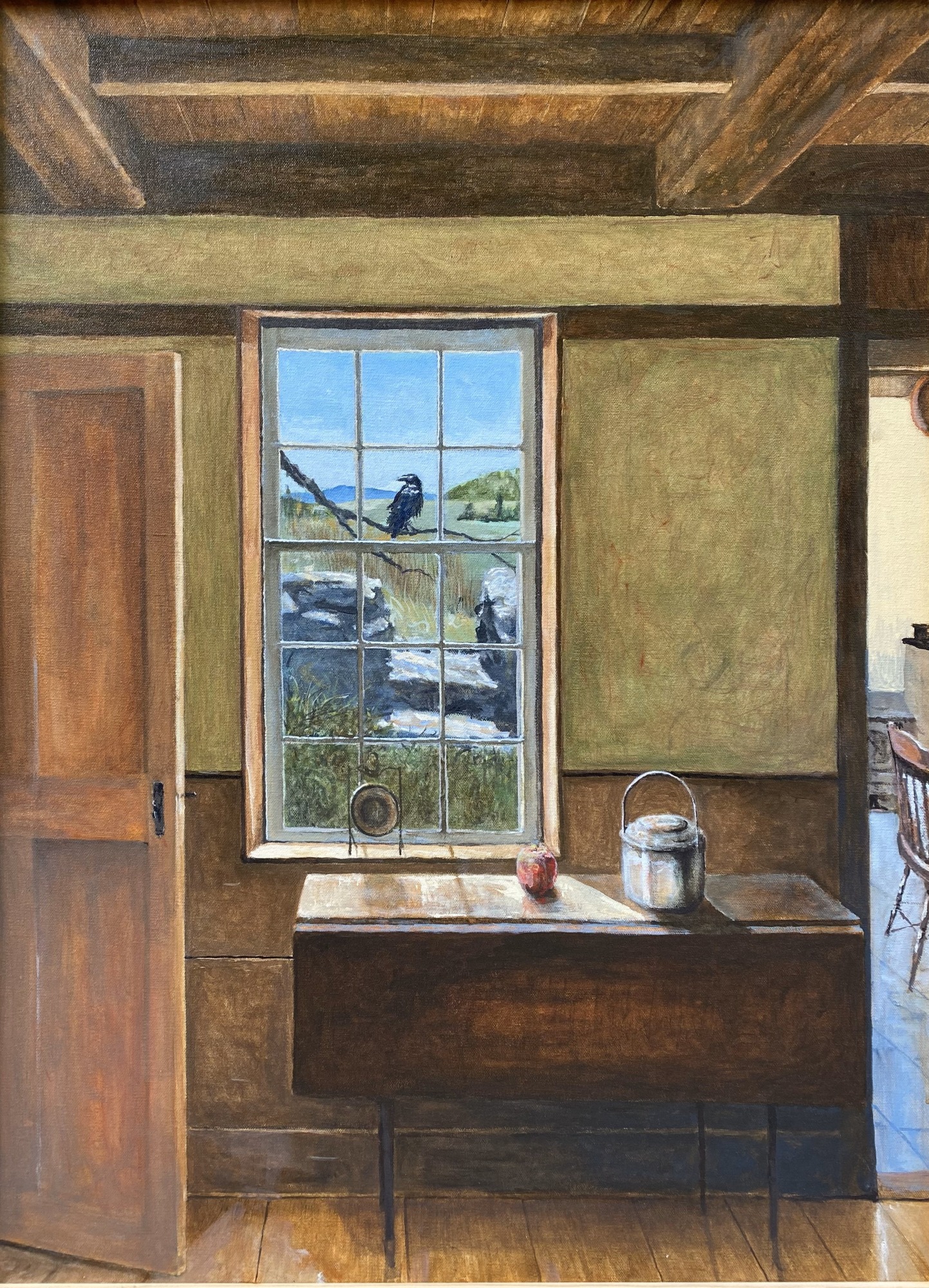 In this dreamlike painting a crow perched on a leafless branch, peers into the window as if returning my look. Beyond the crow, the landscapes recedes to a distant mountain. The window panes fracture the scene into tiles and create a translucent impervious impediment between the two environments. The interior is an antique American Colonial, the door to the left is swung open, suggesting an open path to the outside, and the room beyond to the right is flooded in light pouring in through the unseen side windows. The light from outside illuminates the table and the two objects that lay upon it, an apple and a kettle. A chau gong sits silently on the windowsill. The Crow looks in.