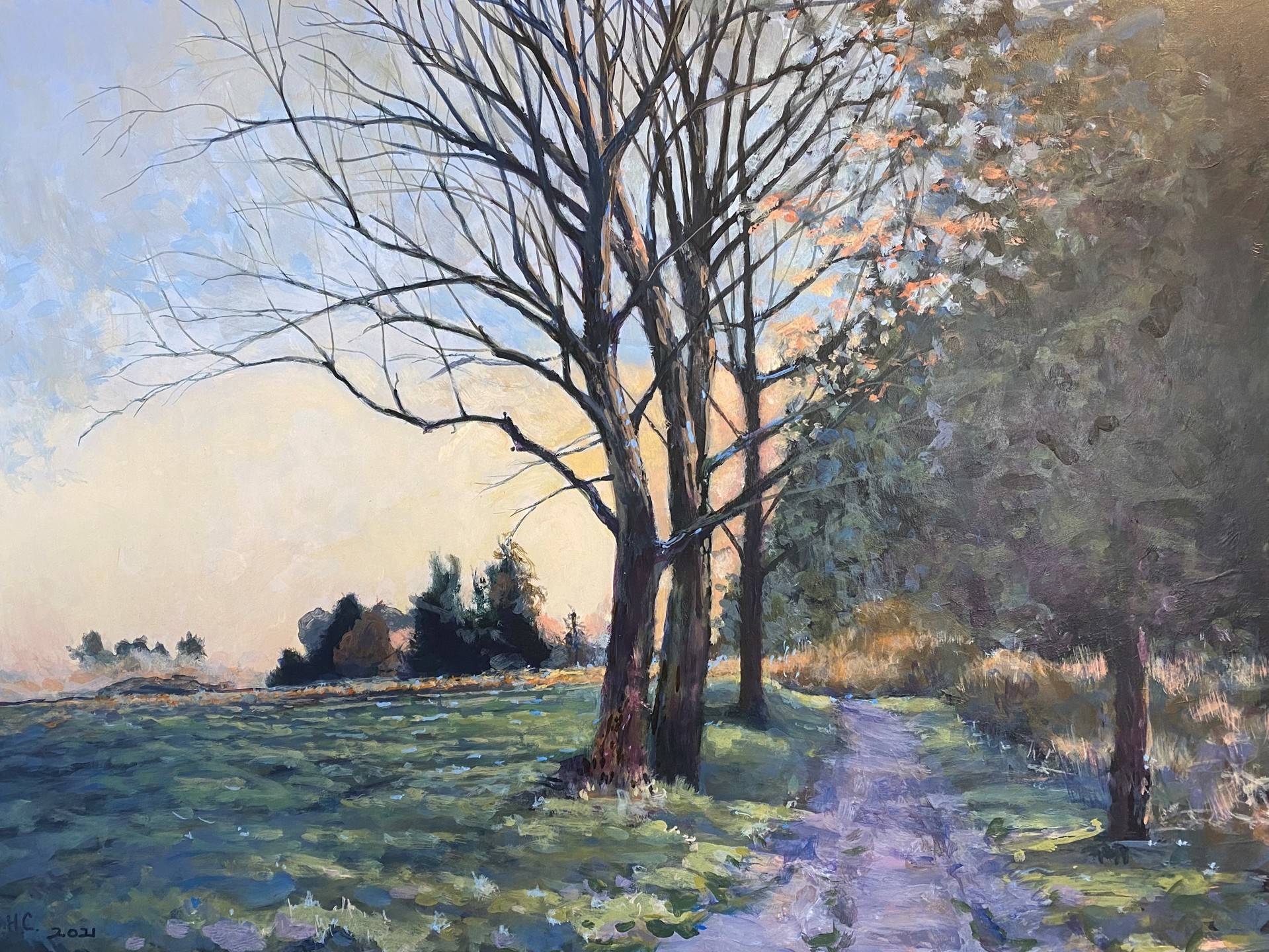 Dawn illuminates a rustic path follows the edge of a crop field in early spring.