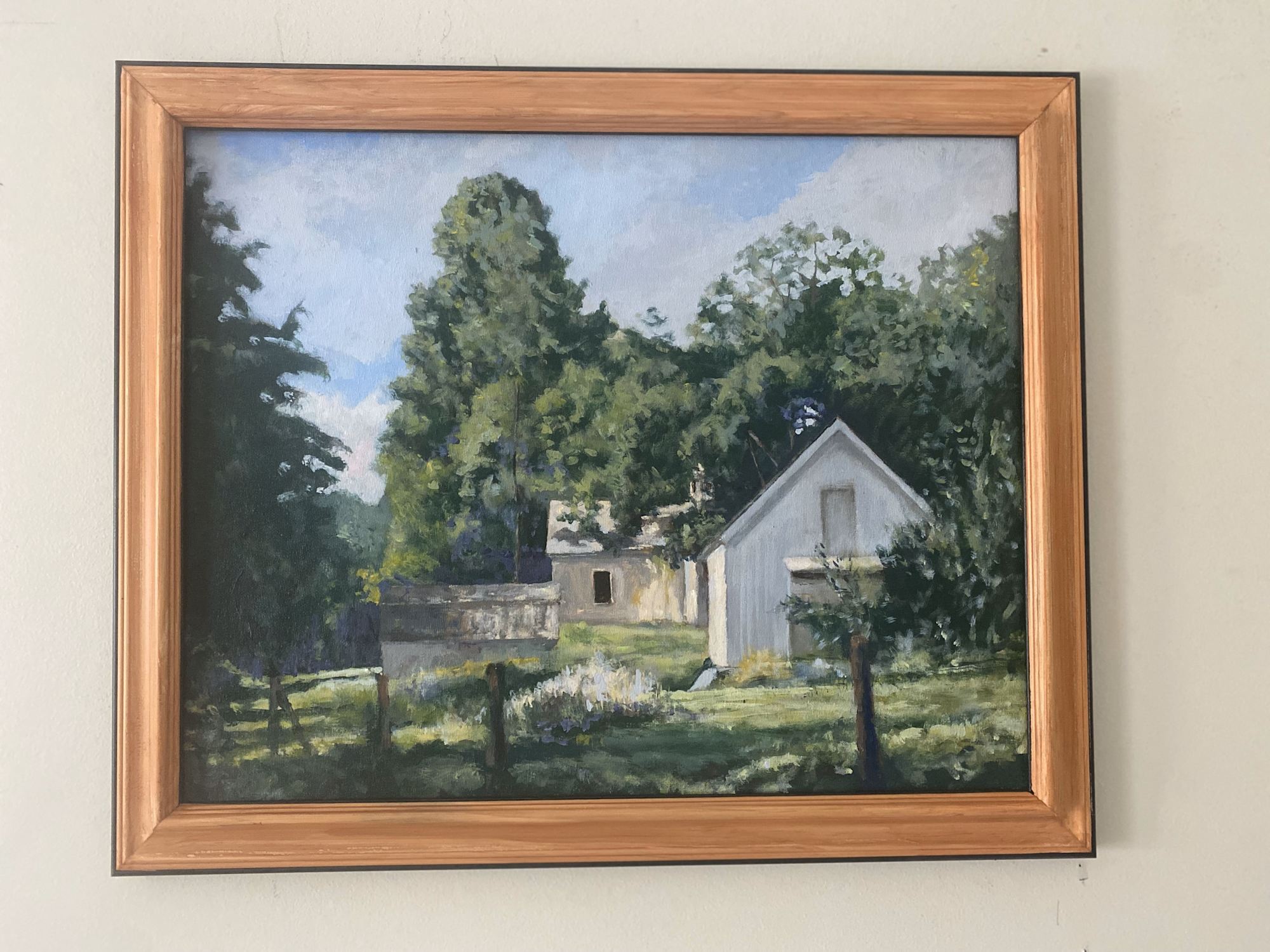 A rural farmhouse and sheds capture the afternoon sunlight.