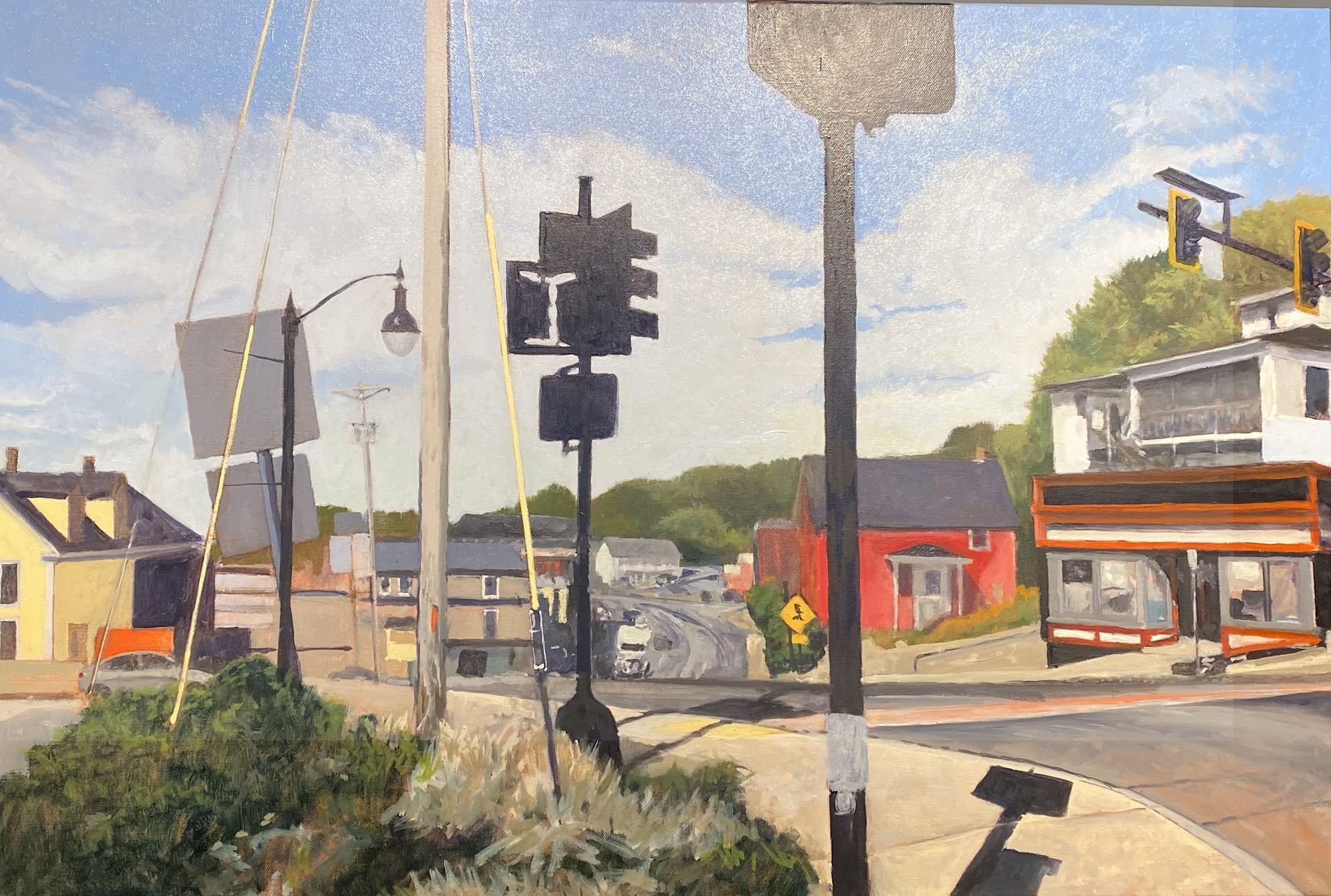 Intersection No. 2 captures a moment in a small town where modern infrastructure meets the enduring character of 20th-century architecture. The composition centers on a sunlit intersection, its array of traffic lights and street signs commanding immediate attention. These elements are not simply functional but become integral to the scene’s structure, their shadows stretching across both sidewalk and asphalt, creating a dynamic interplay of light and form.