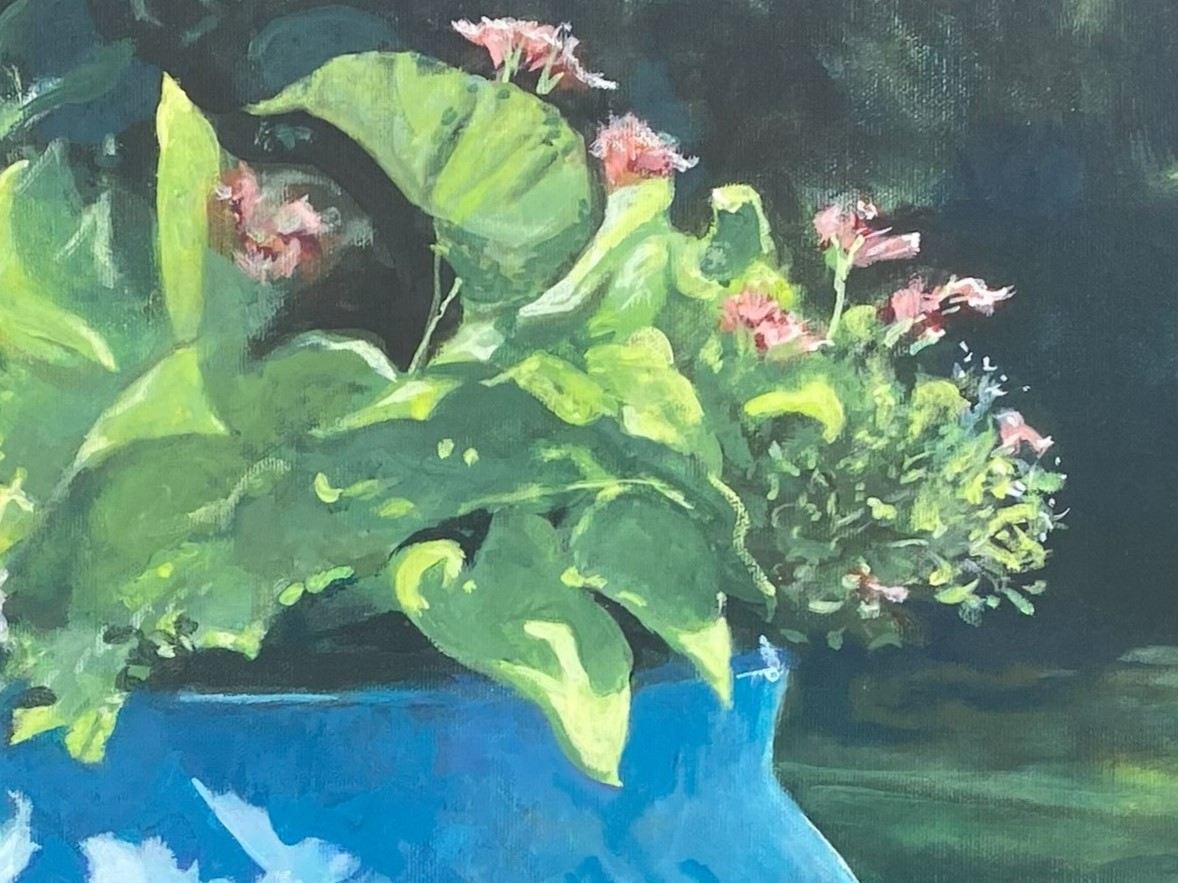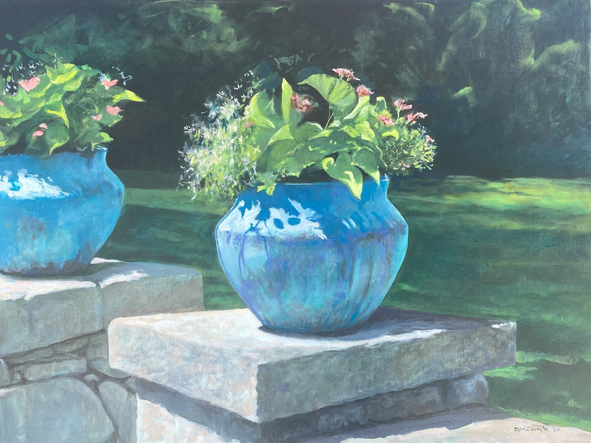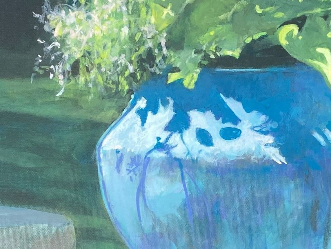 Experience the beauty of nature in this captivating artwork titled "Portal." This acrylic painting on canvas depicts two vibrant oxidized copper pots filled with lush green plant life, set against a backdrop of a sunlit garden. The play of light and shadow on the stone steps adds depth to the scene, creating a serene outdoor moment that will bring a touch of nature into any space. The bold aqua blue vases resting on stone gate posts add a unique touch to this stunning piece. Dive into the world of "Portal" and let its beauty transport you to a peaceful oasis.