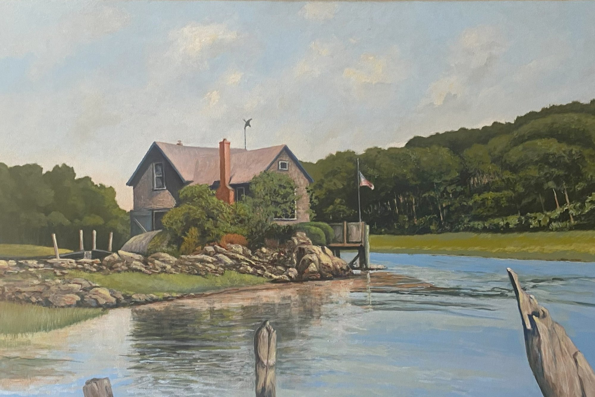 The artwork is a serene landscape painting of a house situated on the rocky shoreline of Turbat Creek, beside a calm body of water. The house displays weathered shakes in a muted brownish color with a prominent red chimney and is surrounded by lush greenery and bushes. To the right of the house, a dock extends over the water, with a flagpole flying a flag at half-mast. The water reflects the house and surrounding scenery softly, enhancing the tranquility of the scene. Dense trees stretch along the background, under a sky filled with soft, muted clouds, suggesting a peaceful, quiet atmosphere. The overall composition emphasizes natural beauty and calmness.