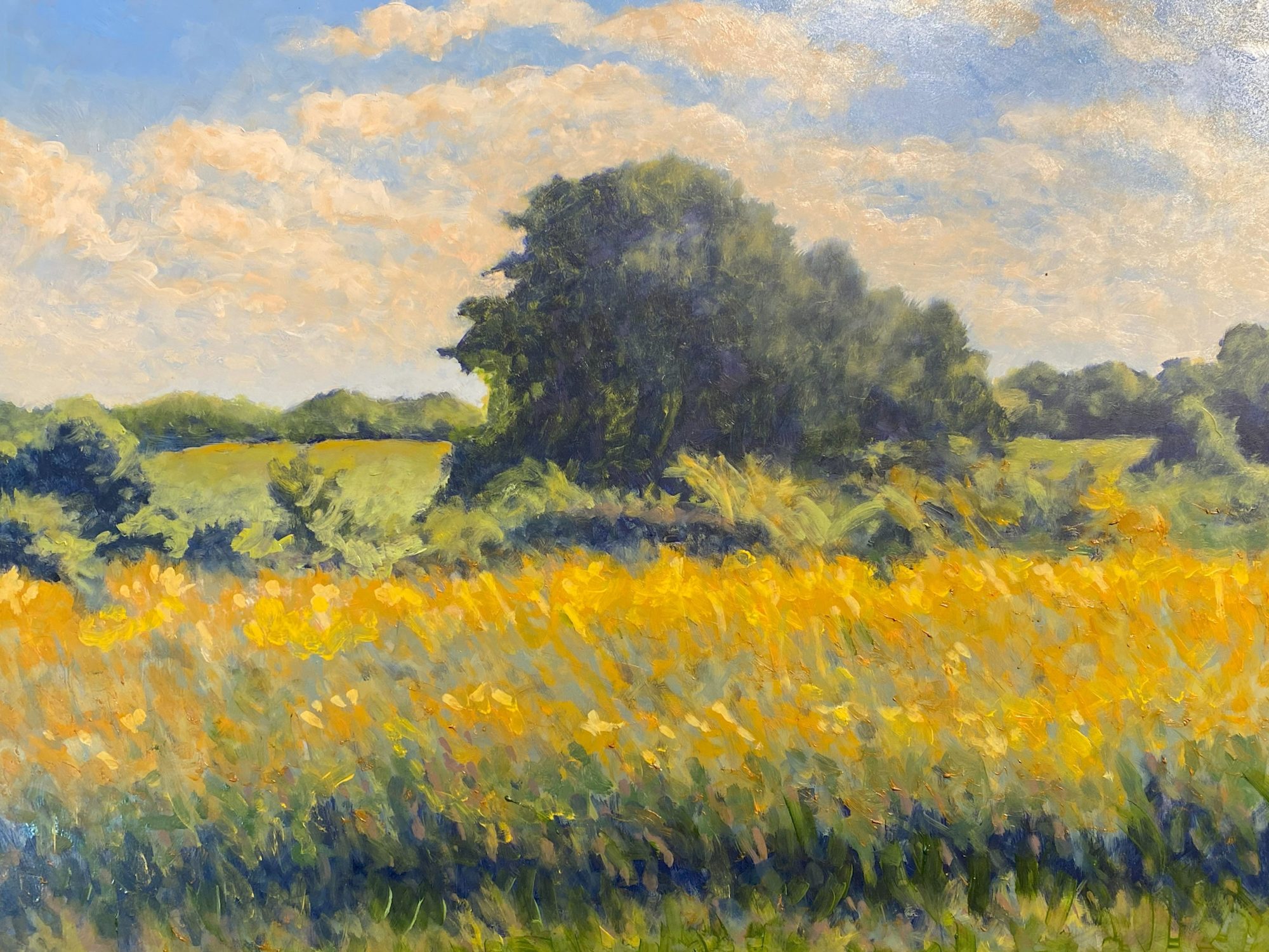 The sky above plays a crucial role, painted with light blues and dotted with soft clouds that seem to drift in sync with the grasses below. This parallel movement creates a visual rhythm that underscores the painting’s title, evoking a gentle breeze and the quiet energy of a countryside afternoon. The brushwork is expressive yet controlled, applying texture and layering to convey the vibrancy and motion of this natural setting without sacrificing clarity.