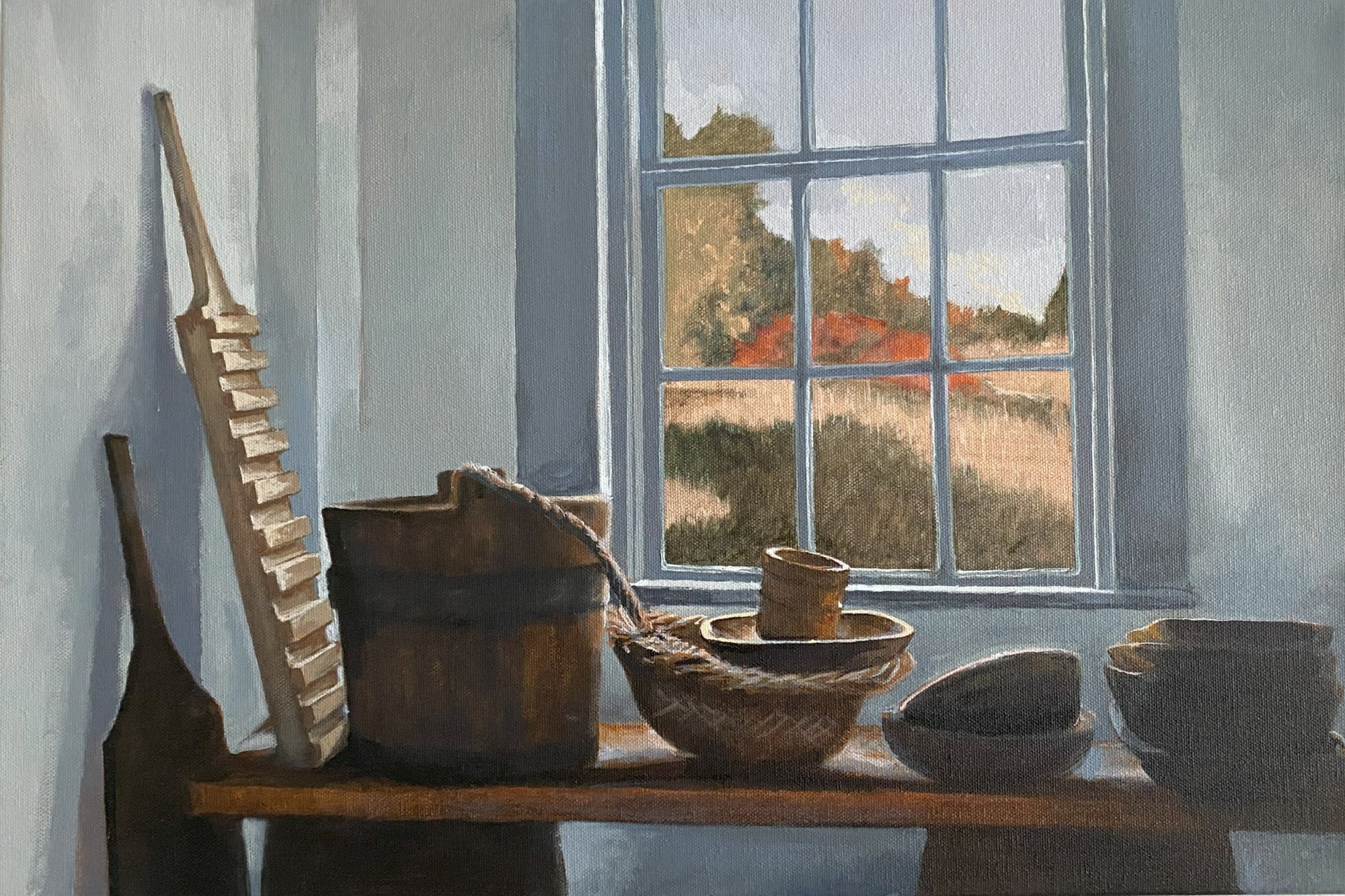 Saturday Morning presents a carefully composed still life that invites the viewer into a quiet, contemplative moment. The scene rests on a wooden surface positioned near a window, where soft natural light filters gently into the interior. A worn wooden washboard leans against the wall, flanked by an assortment of rustic containers—a stoneware jug, woven baskets, and simple bowls—each rendered with attention to texture and form. Beyond the window, a pastoral landscape unfolds, featuring trees and distant buildings with red roofs bathed in warm sunlight, hinting at a peaceful rural setting.