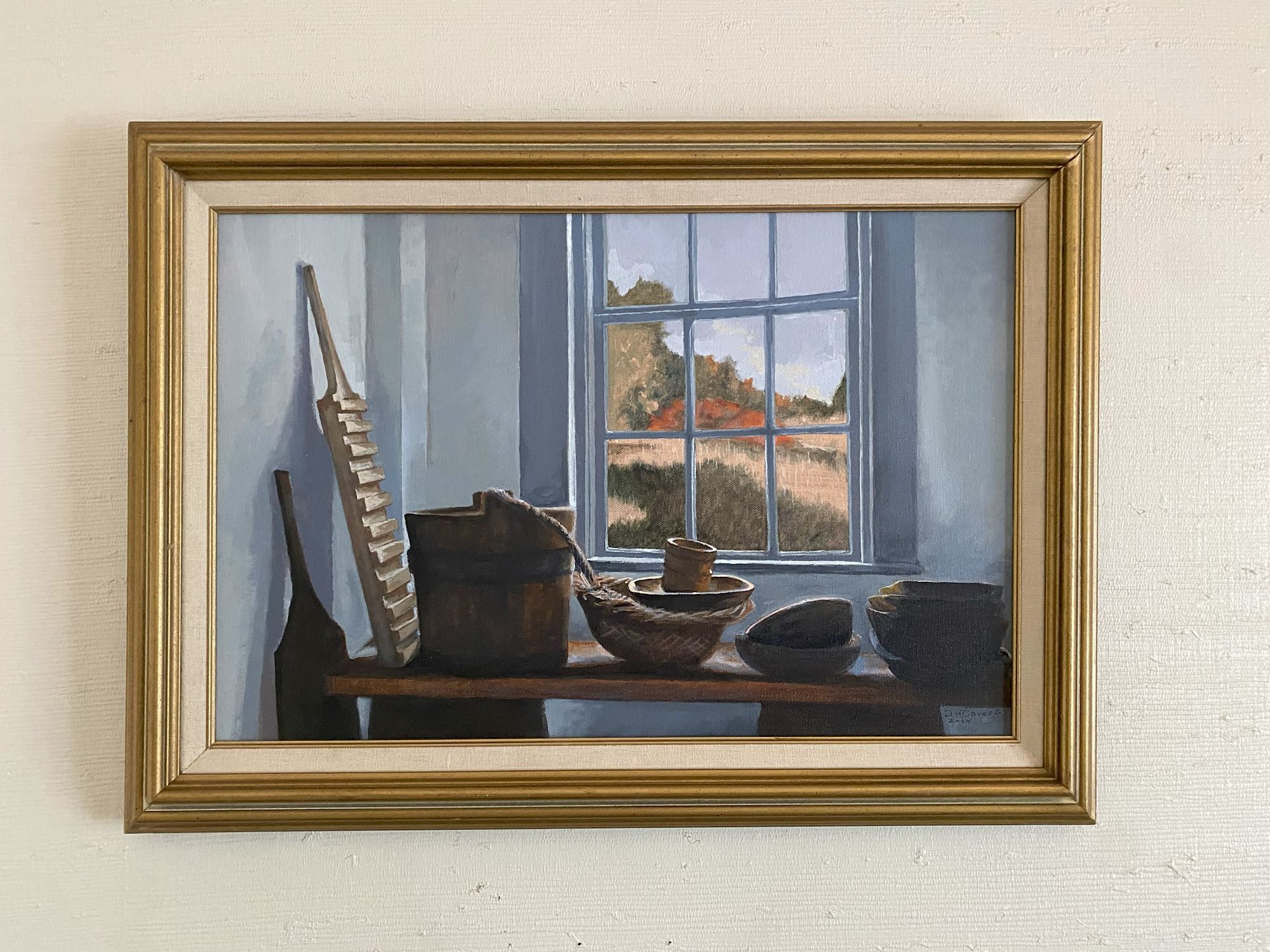 The contrast between the cool, subdued tones inside and the warm glow outside creates a subtle dialogue between interior stillness and exterior life. The painting’s restrained palette and thoughtful arrangement emphasize quietude and reflection without sacrificing visual interest. Every element contributes to an atmosphere that feels both familiar and meditative, grounded in the traditions of still life while resonating with an understated emotional depth.