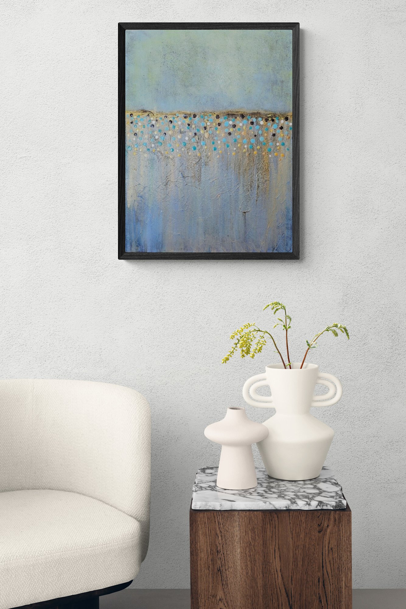 The artwork features a textured abstract composition dominated by shades of blue and green. The canvas is split horizontally, with the upper portion painted in a soft, muted green that transitions into a pale blue. Along the dividing line, a series of multicolored dots in blue, yellow, and black are scattered, creating a lively contrast against the tranquil background. The lower part of the piece is characterized by vertical streaks of blue, giving the impression of depth and movement. The overall effect is a harmonious blend of color and texture.