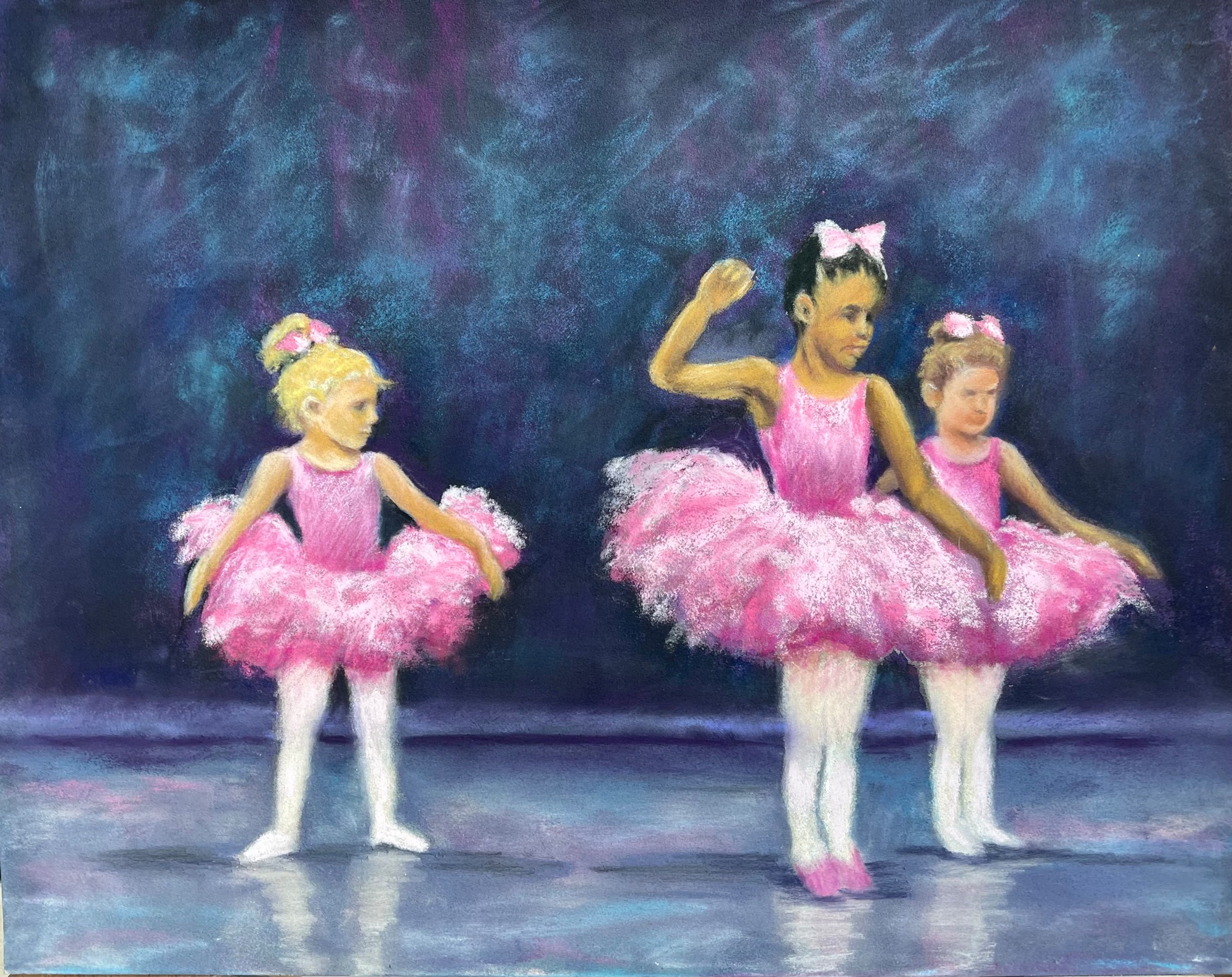 11x14 pastel on Pastelmat. As the little ballerinas were on stage during their recital the one on the left was following her own music; thus the title "Be Different."