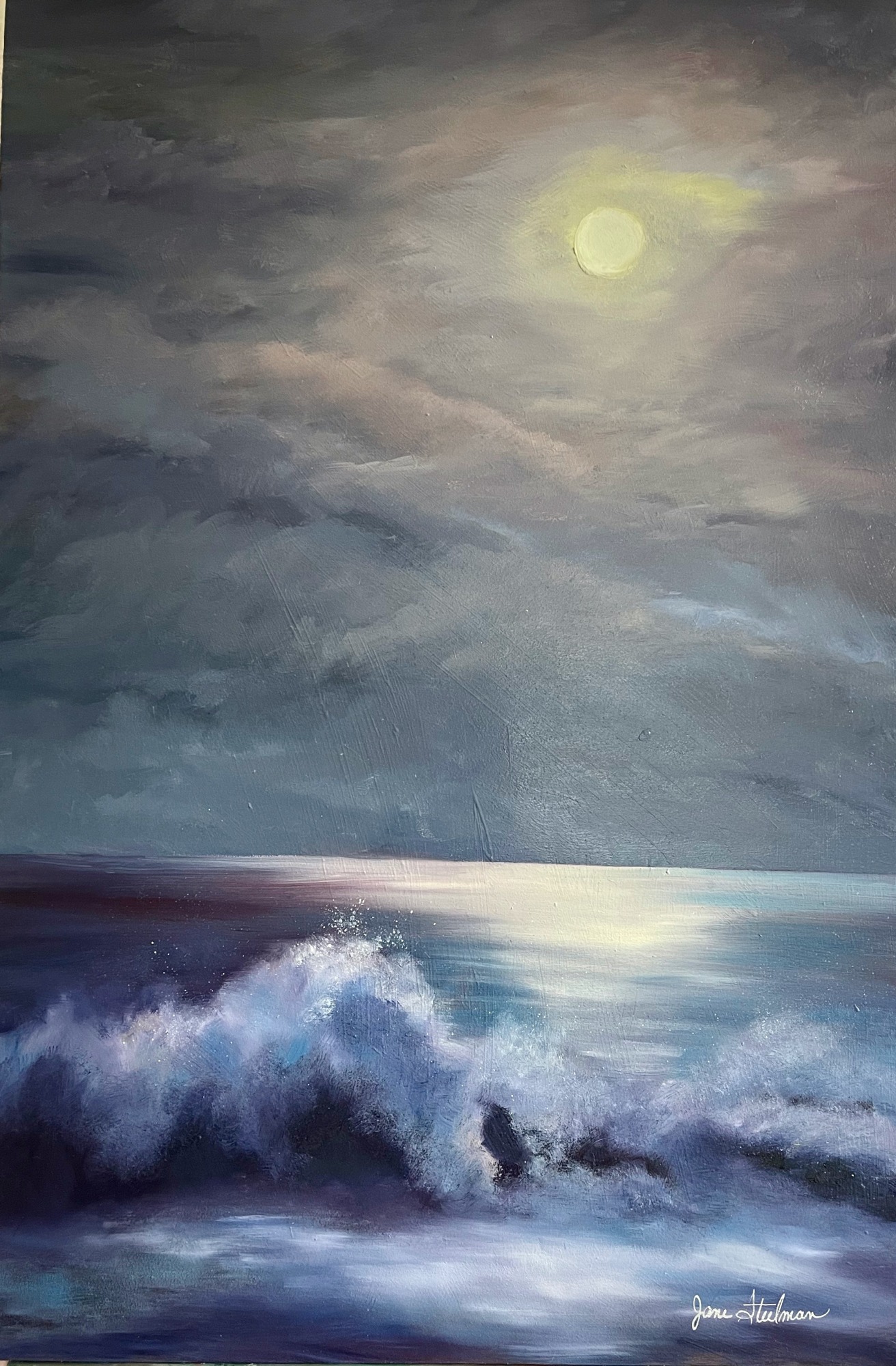 This 24X36 oil on panel painting was inspired by the nights on the east coast watching and listening to the ocean by moonlight. I love how the moonlight dances on the waves and how the sound of the ocean is calming. The best time to be at the beach for me is when no-one else is around; the winter, the night.
