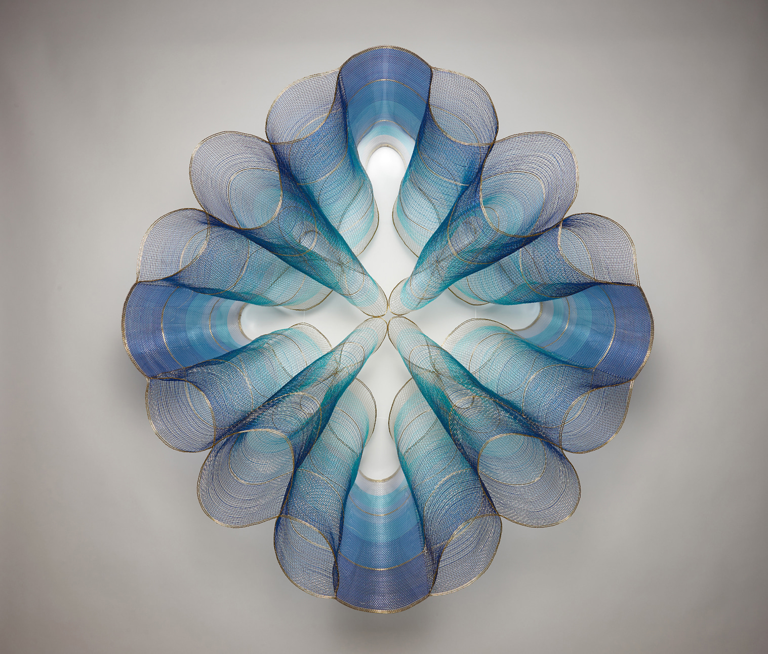 Anastasia Azure's sculptural forms are created by interlacing hand-dyed nylon and wire into woven layers that gracefully undulate and intersect,