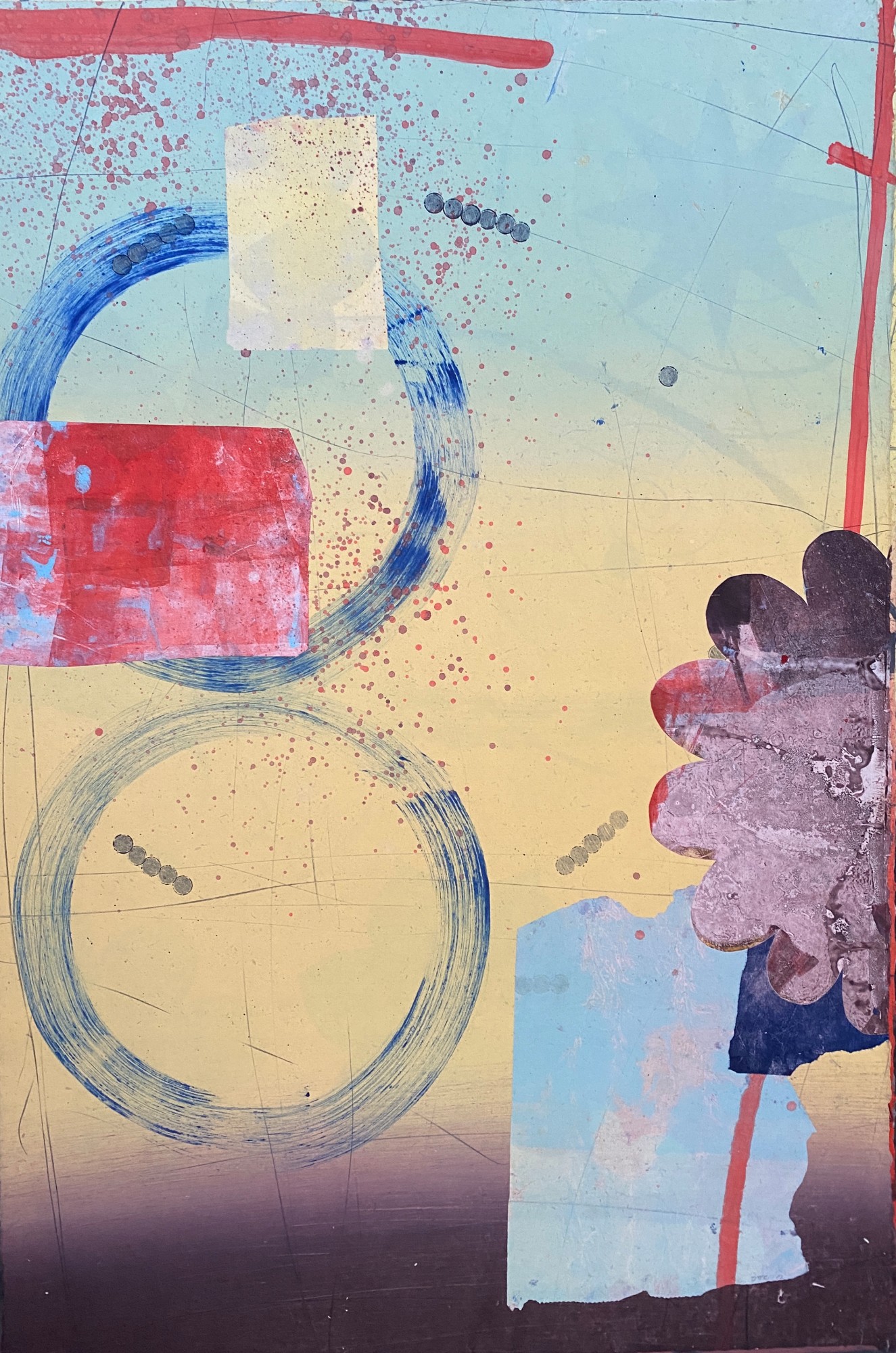 “The pictorial engine that propels much of the work of the painter and printmaker David Collins is a dialogue between crisply defined geometrical shapes and decorative motifs and a vast immersive space, an infinitely expanding formlessness that is bounded (literally but not in the viewer’s imagination) by the painting’s outside edge. Collins proposes a dynamic tension between these seemingly oppositional forces or conditions and achieves a dialectical resolution—tenuous in some works, seemingly inevitable in others—that conveys a sense of complex pressures aligning in compositional harmony.” -Stephen Maine