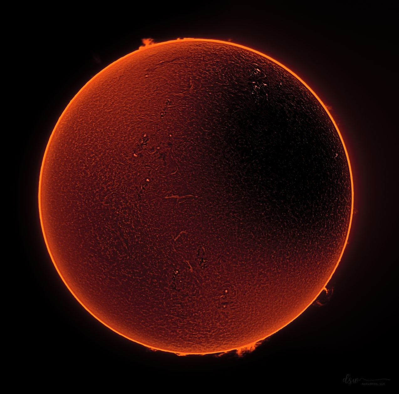 On April 22nd, 2024, I took this image of the sun. It was after the total solar eclipse and before the x-flares that slammed into earth creating an unprecedented display of Aurora. I call this, "The in between sun." The technique I use is to take a slow exposure video that washes out the sun's surface, so it appears to be a white disc, but shows all of the details of the edge with the large solar flare prominences. I then take a faster exposure video that captures the details on the surface, such as mega sunspots. Subtracting the second from the first results in a "reverse" that is strikingly detailed and beautiful on black metal.