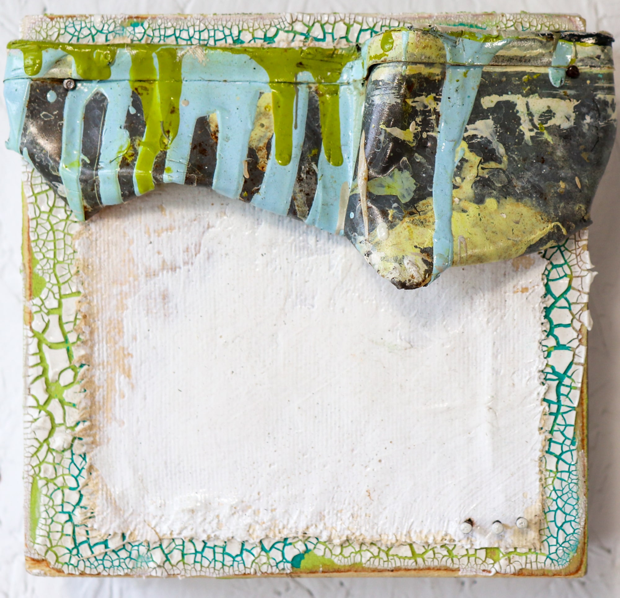 Acrylic on wood panel with crackling texture, ripped canvas piece and topped with a painted salvaged metal piece.