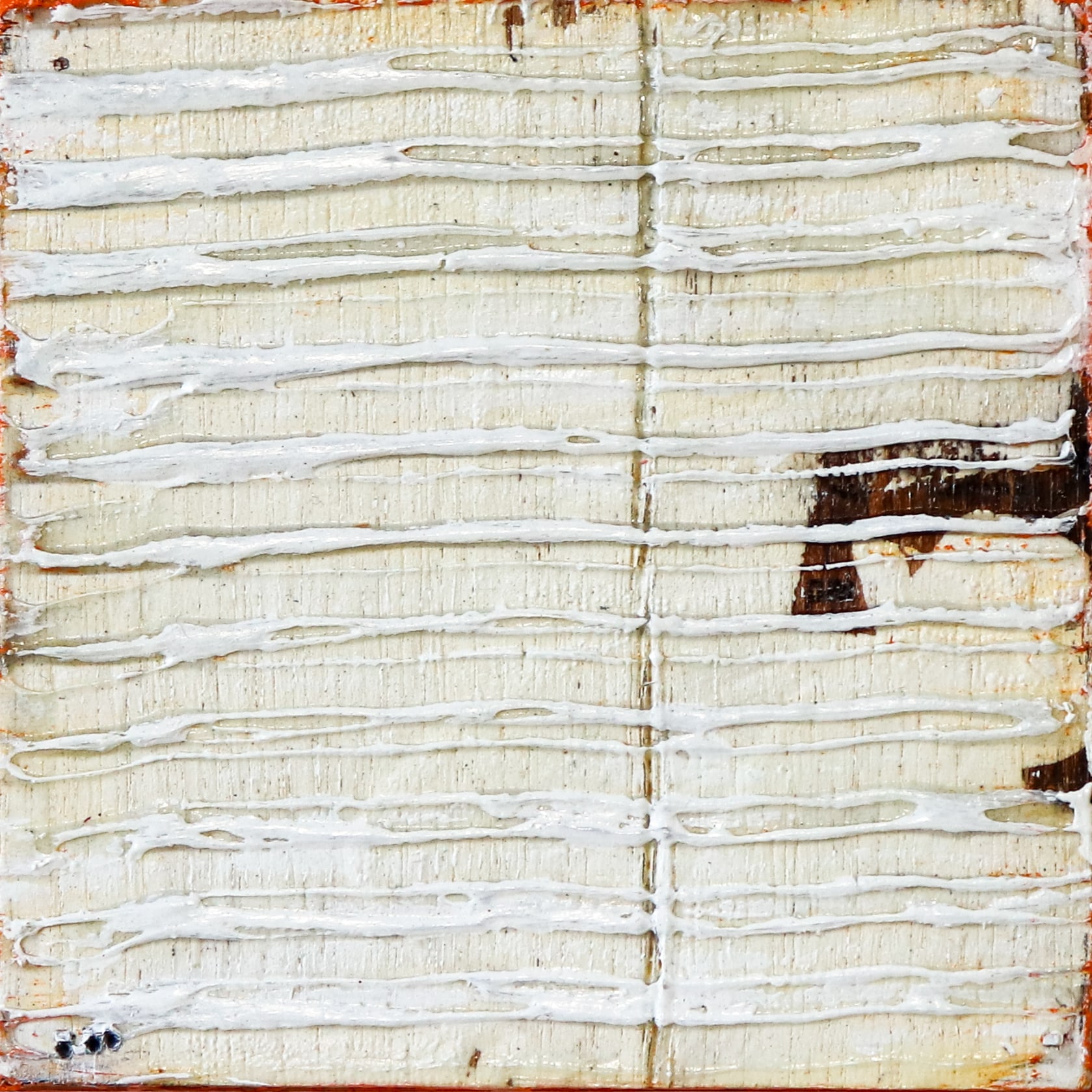 Acrylic on wood panel with industrial adhesive stripes, bright orange sides and signature 3 nails.