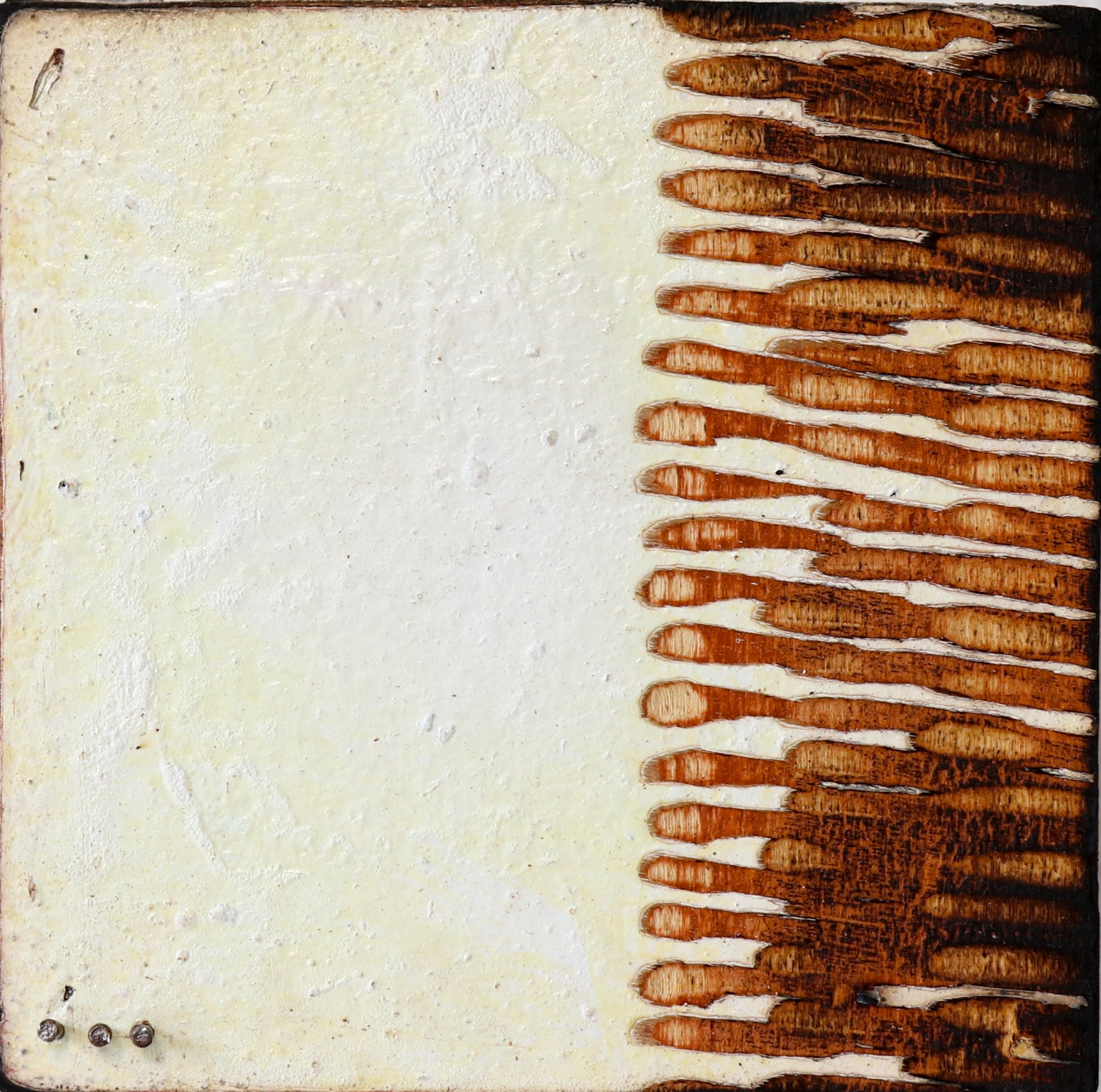 Acrylic on wood panel with burned edges, carving and 3 signature nails.