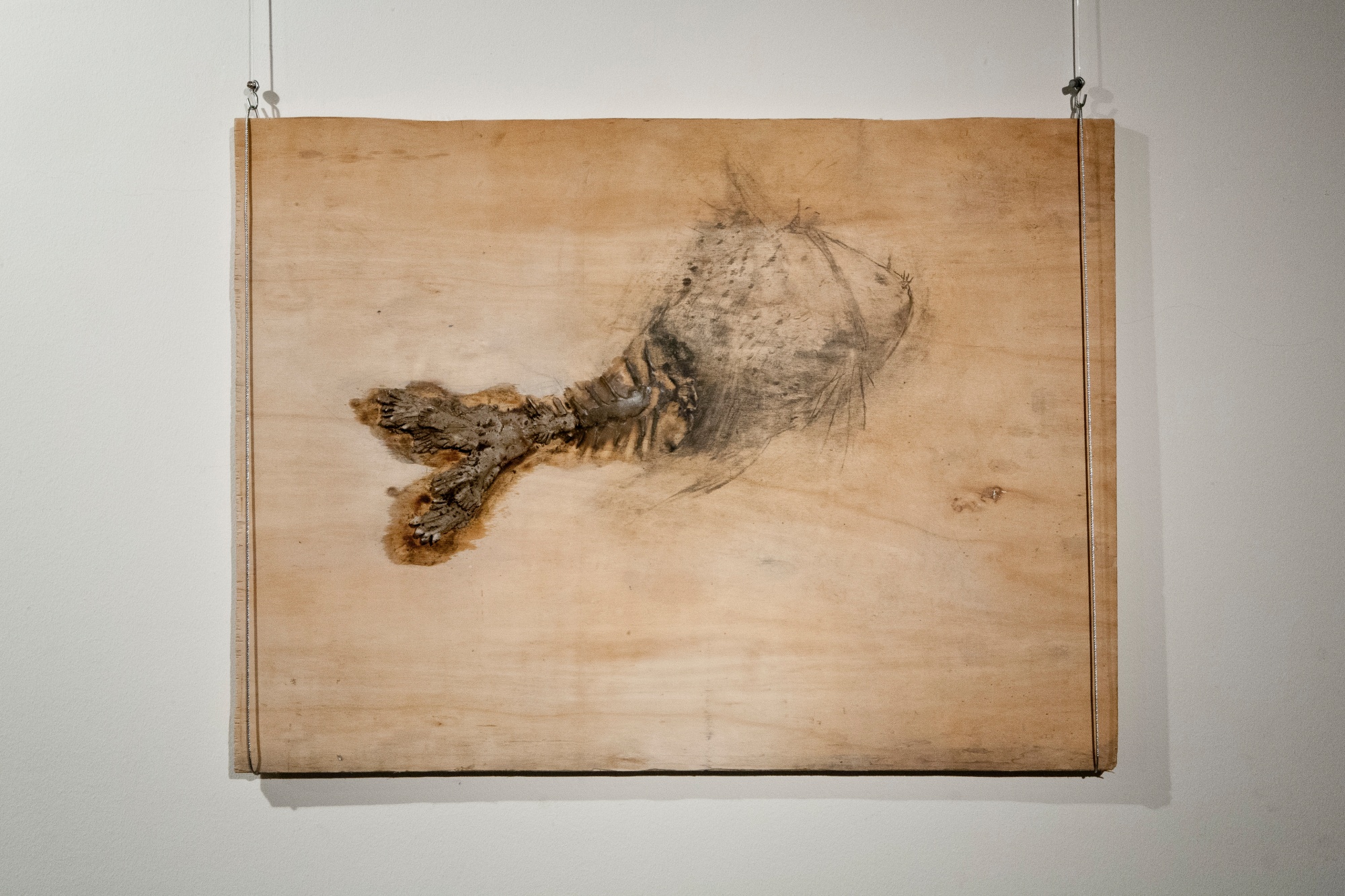 Ceramic paste, charcoal and virgin beeswax on wood.