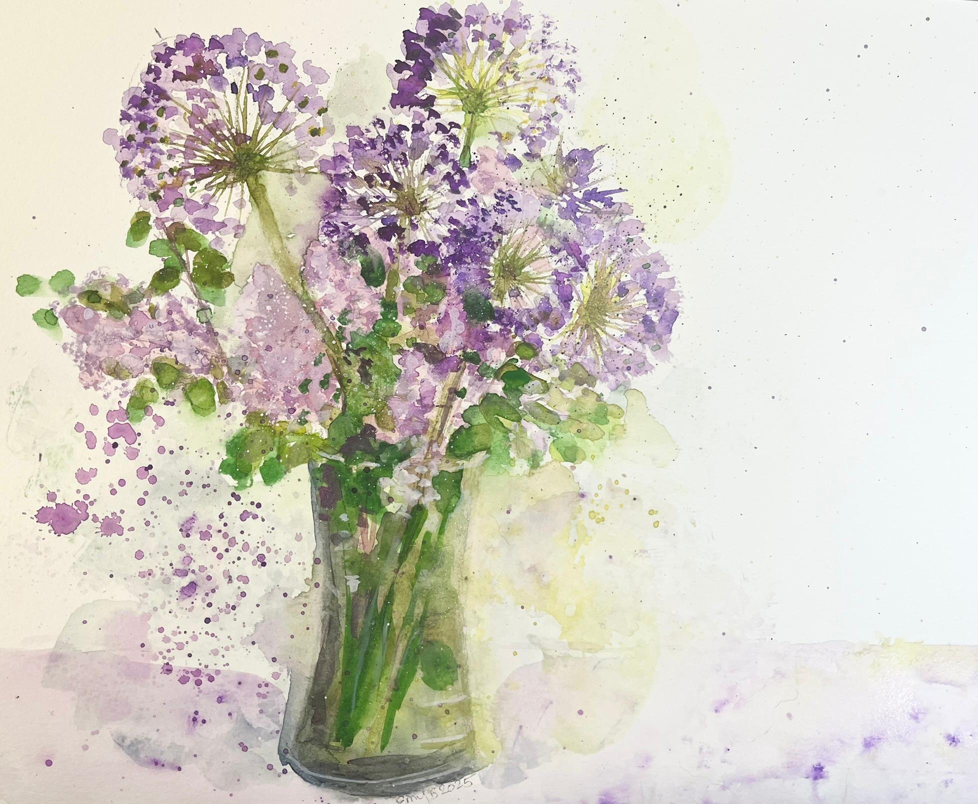 still life watercolor painting of vase of fresh picked allium and lilac blooms from my own backyard!