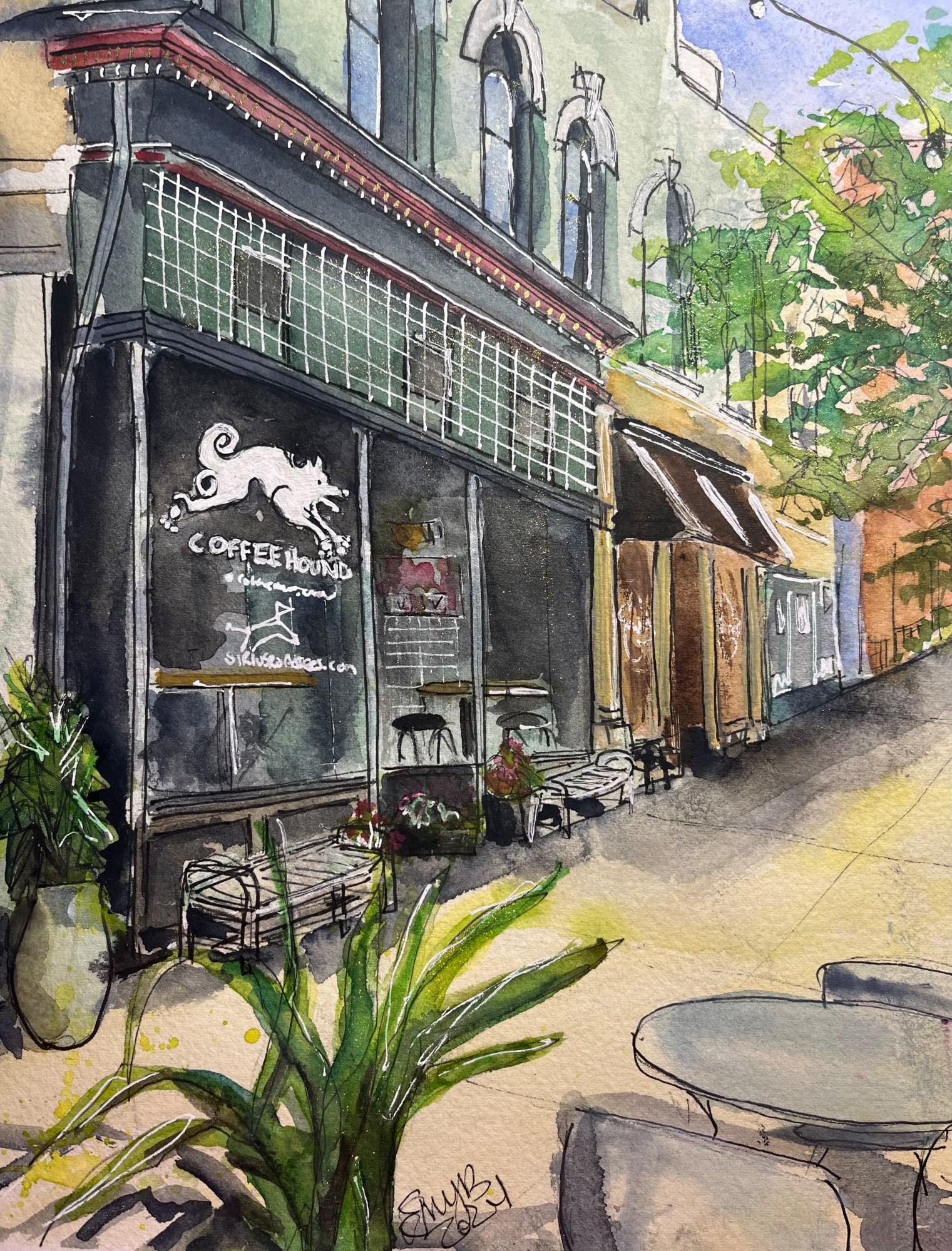 water color and ink painting of Coffee Hound in downtown bloomington, illinois