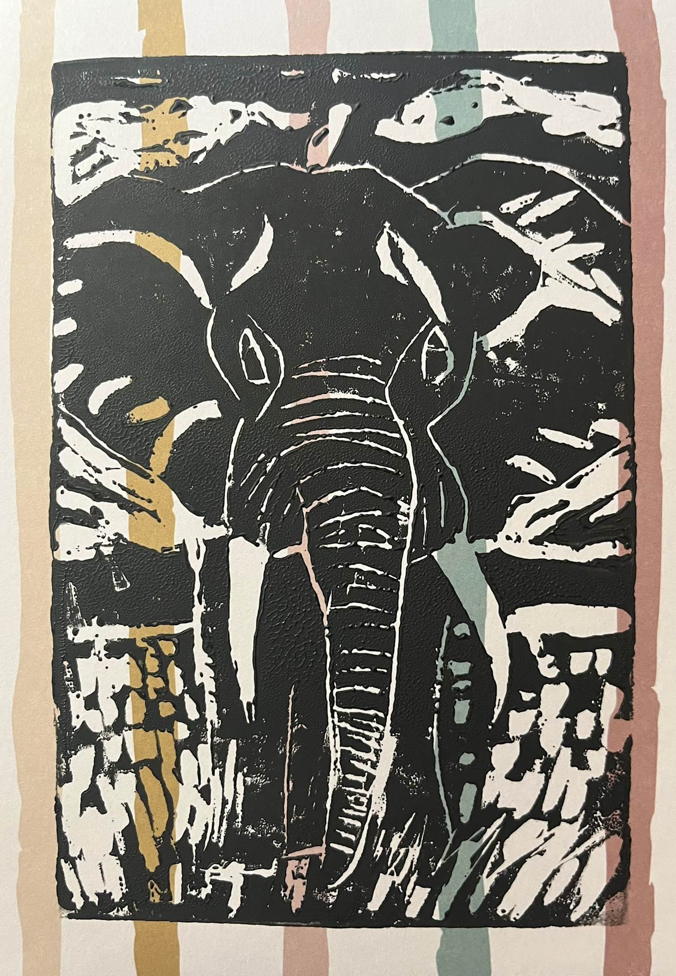 Unframed 5 x 7 linocut block print of an elephant printed on patterned papers