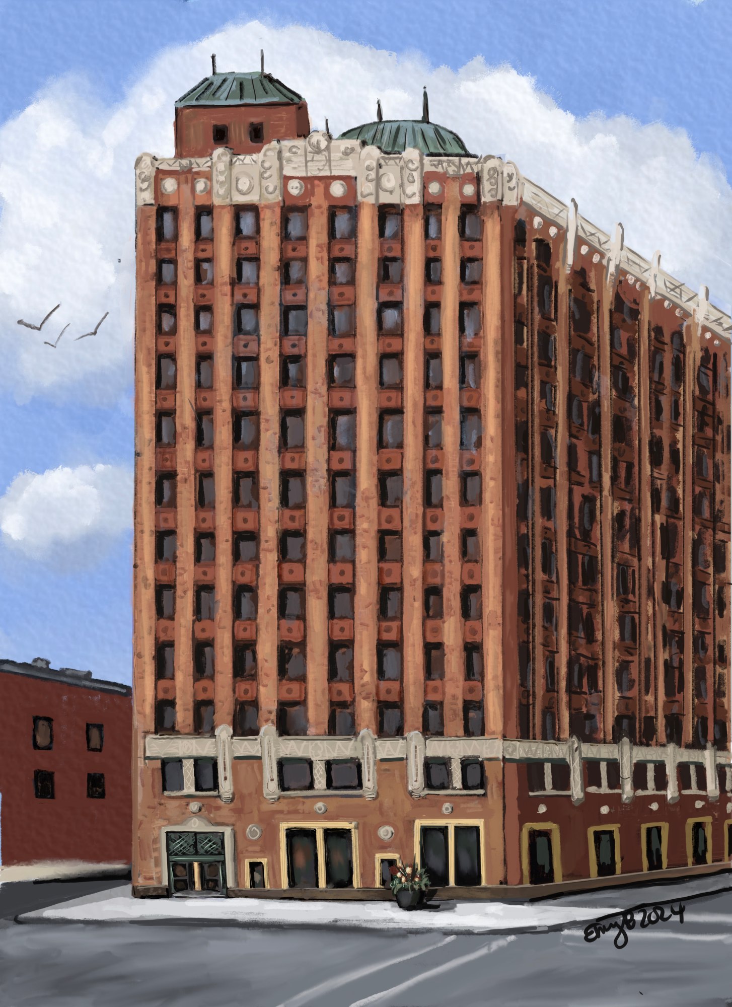 Digital watercolor painting of old State Farm building in downtown Bloomington, IL. Prints and canvas prints available