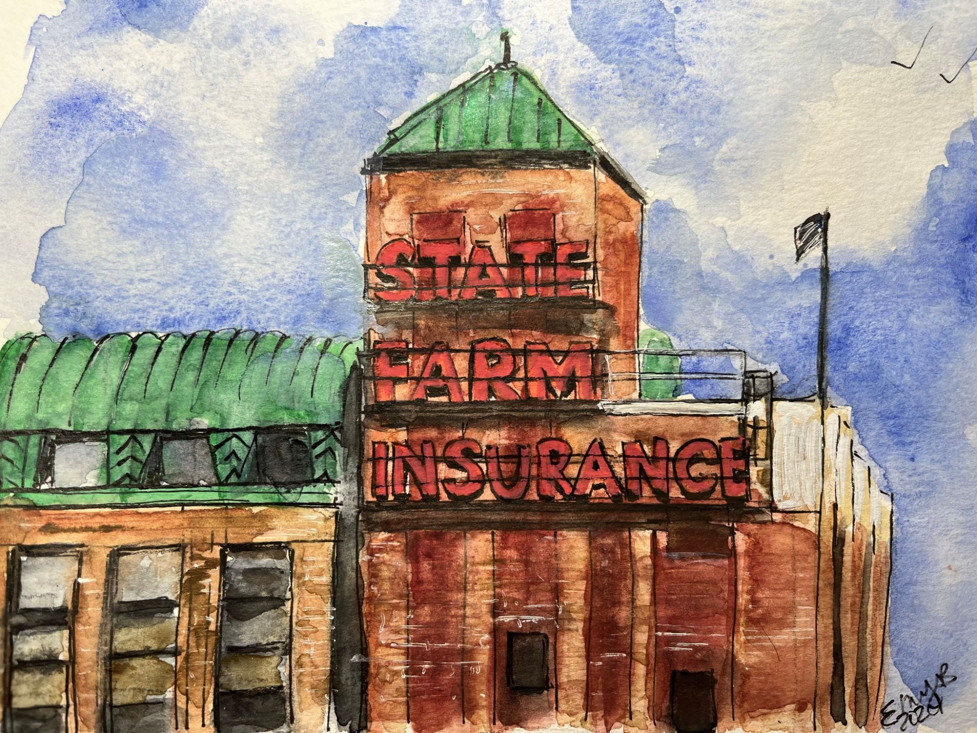 Watercolor and Ink painting of top of old State Farm Building. Letters were removed in 2018. $65 Framed, $50 unframed