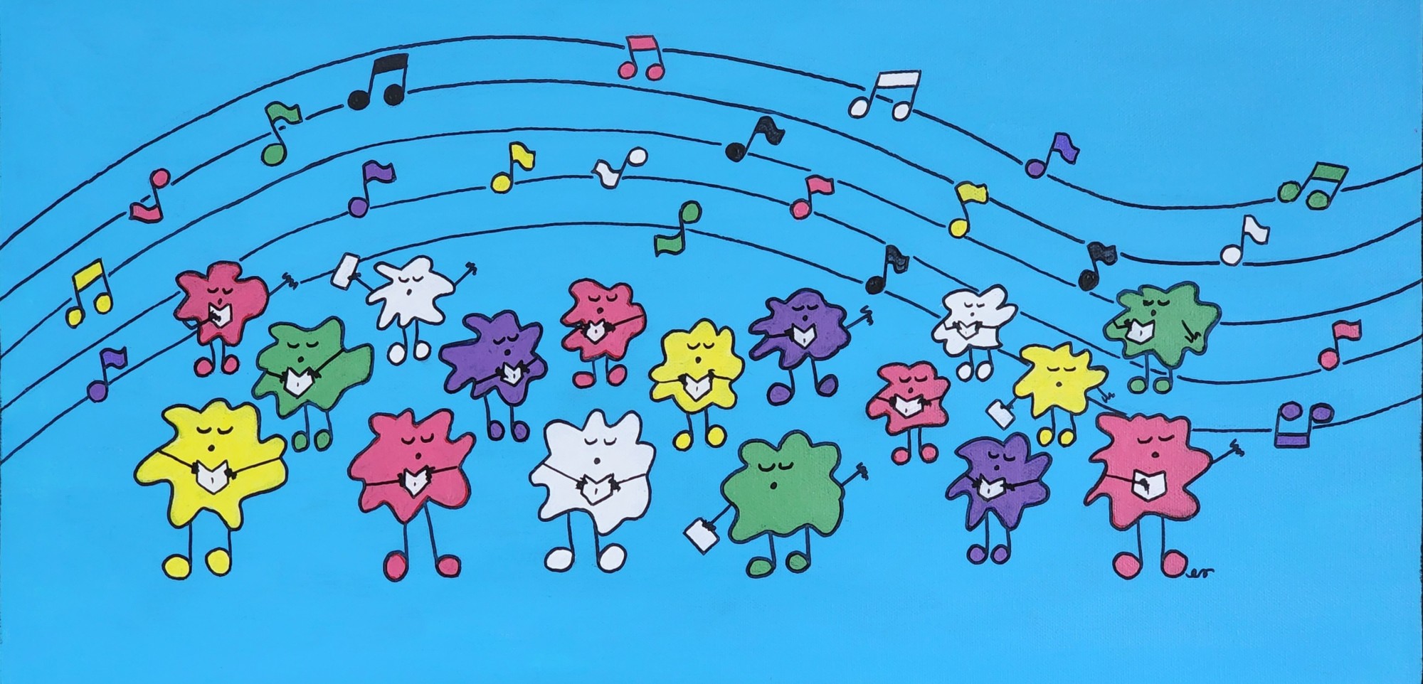 The Chorus was conceived as an idea for a Christmas illustration. Originally a hand-drawn pencil and colored pencil drawing, it was digitally enhanced and colored and became a notecard and a print, and was altered to fit on merchandise, like a coffee mug. This painting, acrylic on canvas, includes a stave for the notes to sit on or near and a handful of additional singers. This is currently available for sale through Creative Liberties Studios and Gallery. Message me here through my profile page and I'll take you through the purchase transaction.