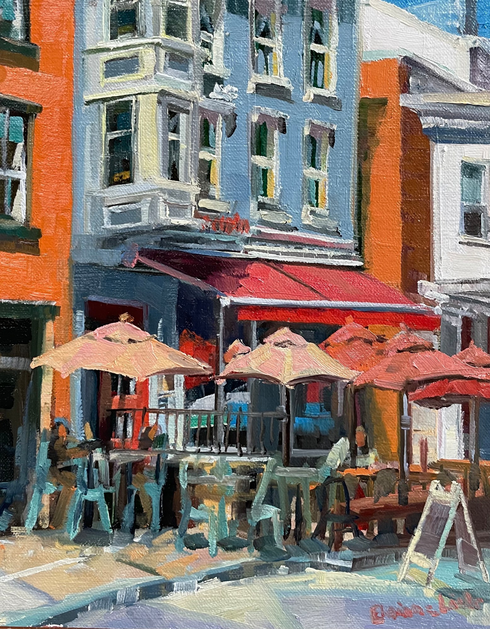plein air painting from Main Street showing the umbrellas of the Couch Tomato Cafe
