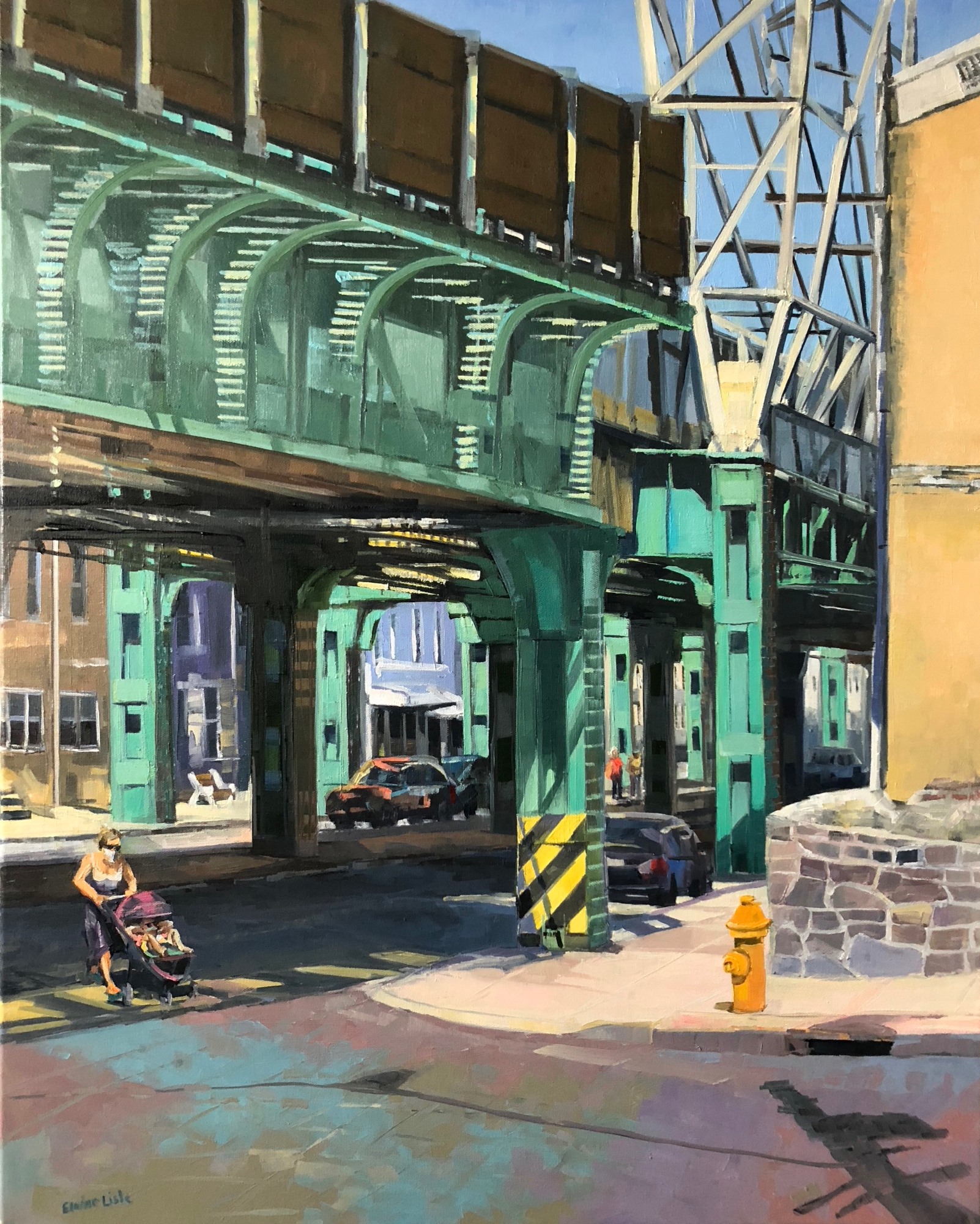 Studio painting done of the elevated subway in Manayunk. Figures of mother & baby can seen wearing face masks, due to COVID pandemic. Plein air study used as reference.