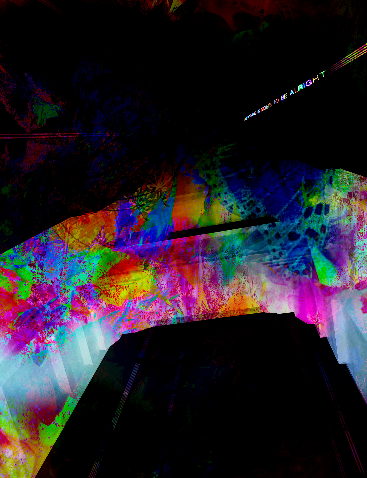 Combining the exuberant flower symbols and fog of San Francisco with the iconic golden gate bridge at night. A message from a strip of neon seen in Istanbul becomes one of the bridge supports. “Everything’s Going to be Alright”