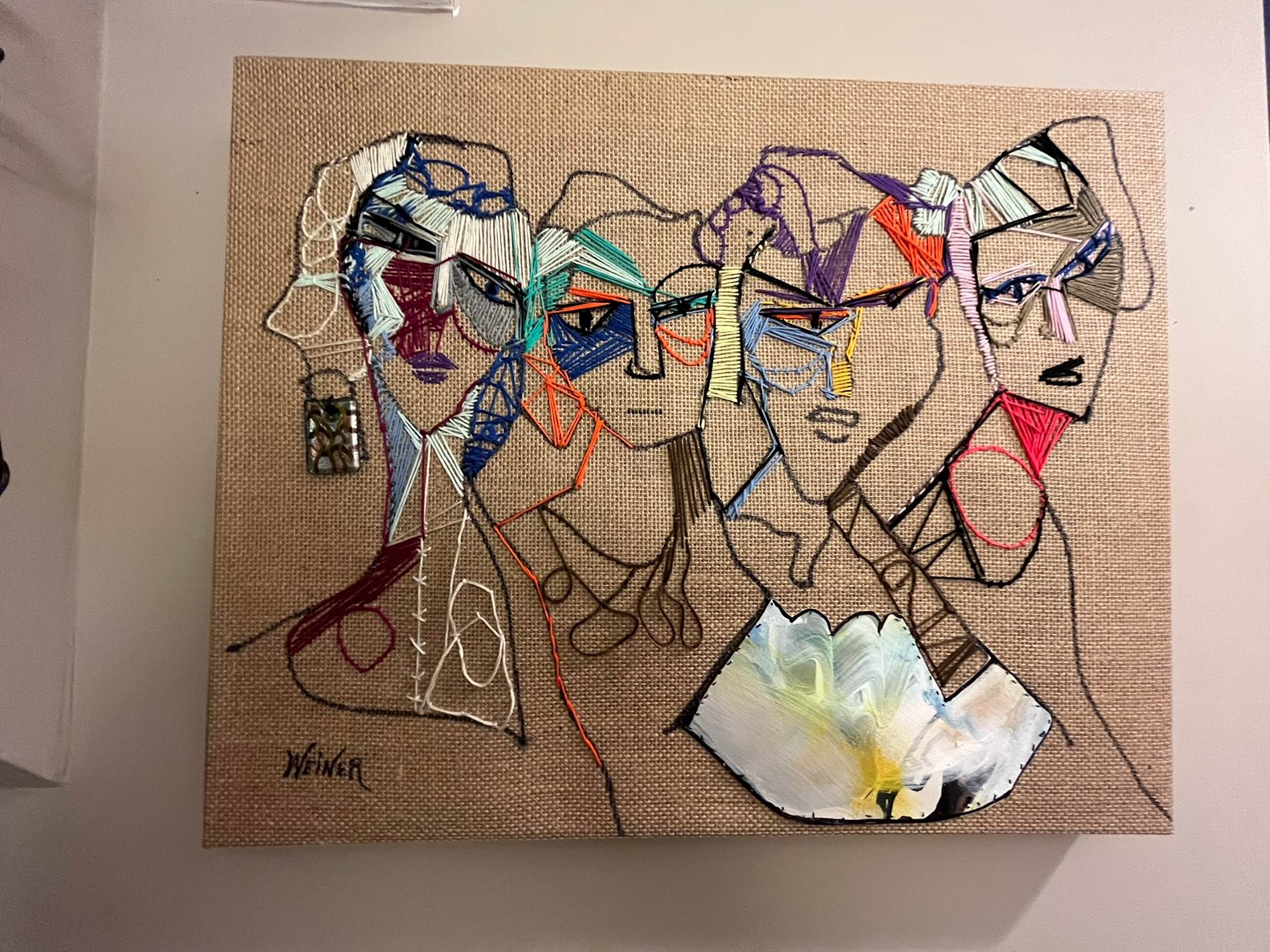 - Subject Matter: Faces - Return to my embroidery roots when I was a teen - Masks and Mirrors Series - First in New "Stitched Up" Series on burlap canvas