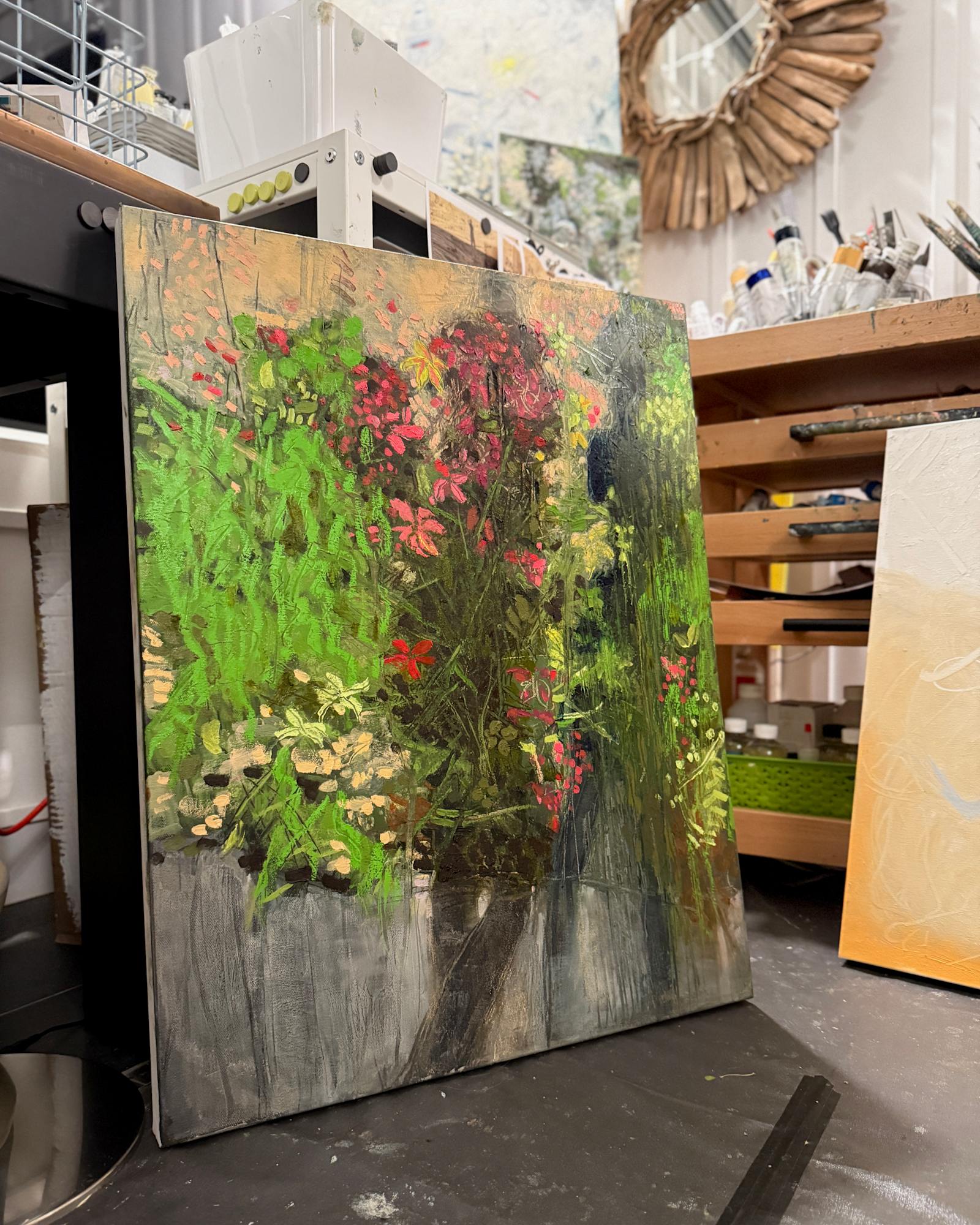 Depth And Substance by Elena Behrakis  Image: Vibrant floral expressive painting of two women's shadows disappearing into nature