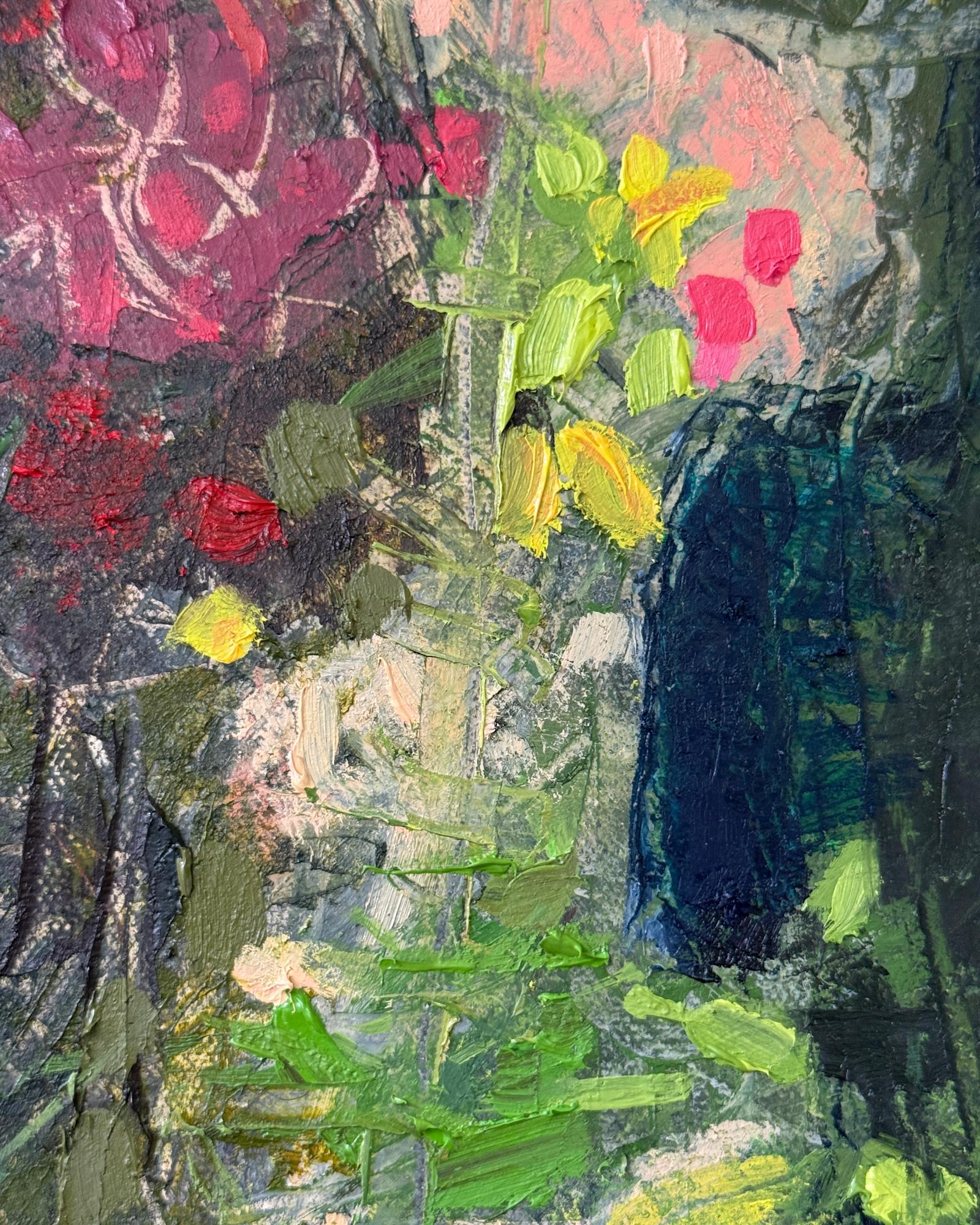 Vibrant floral expressive painting of two women's shadows disappearing into nature