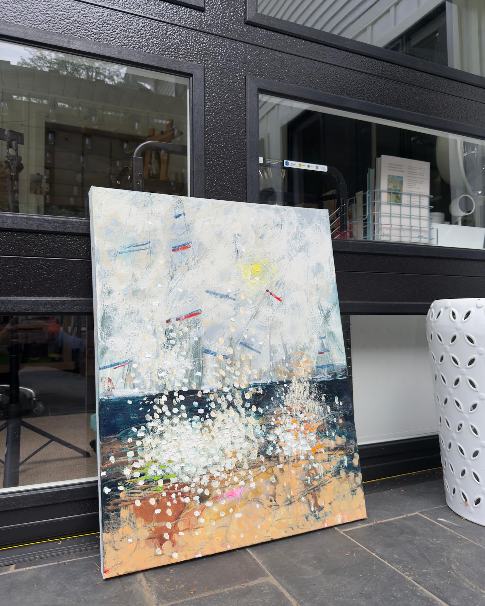 Drowning In It by Elena Behrakis  Image: Expressive painting of three women consumed by white waves with sailboats behind them.
