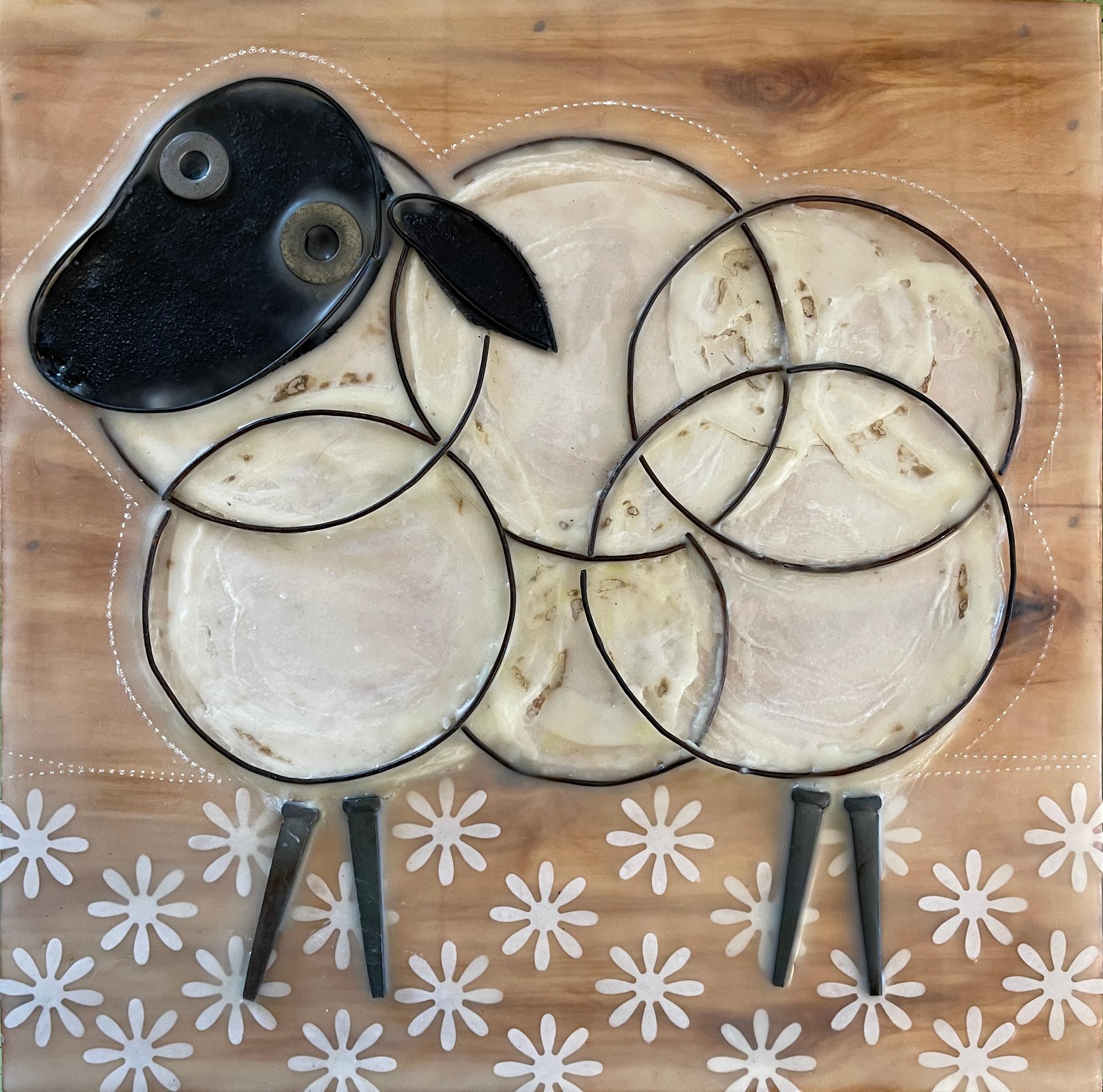 Sheep looking left, large circles outlined in wire for fleece, and white punched flowers for ground