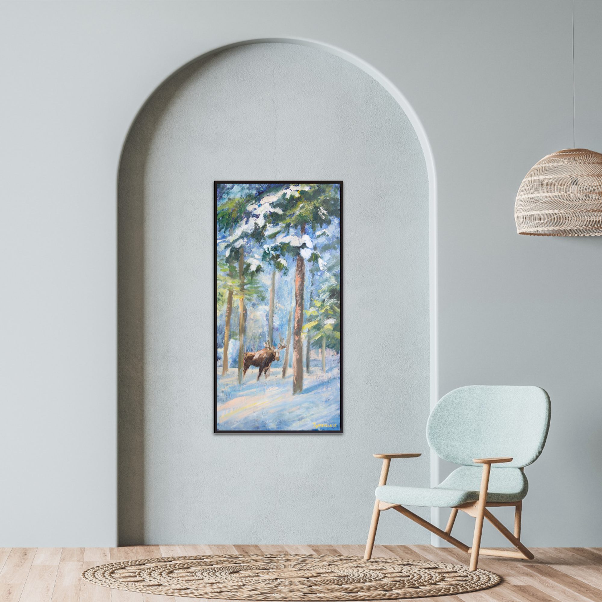 In the middle of the painting, a large moose stands among the trees. Its dark brown body contrasts with the light background, making it the main focus of the artwork. The snow-covered ground is painted with soft, blended colours, creating a calm and quiet atmosphere.