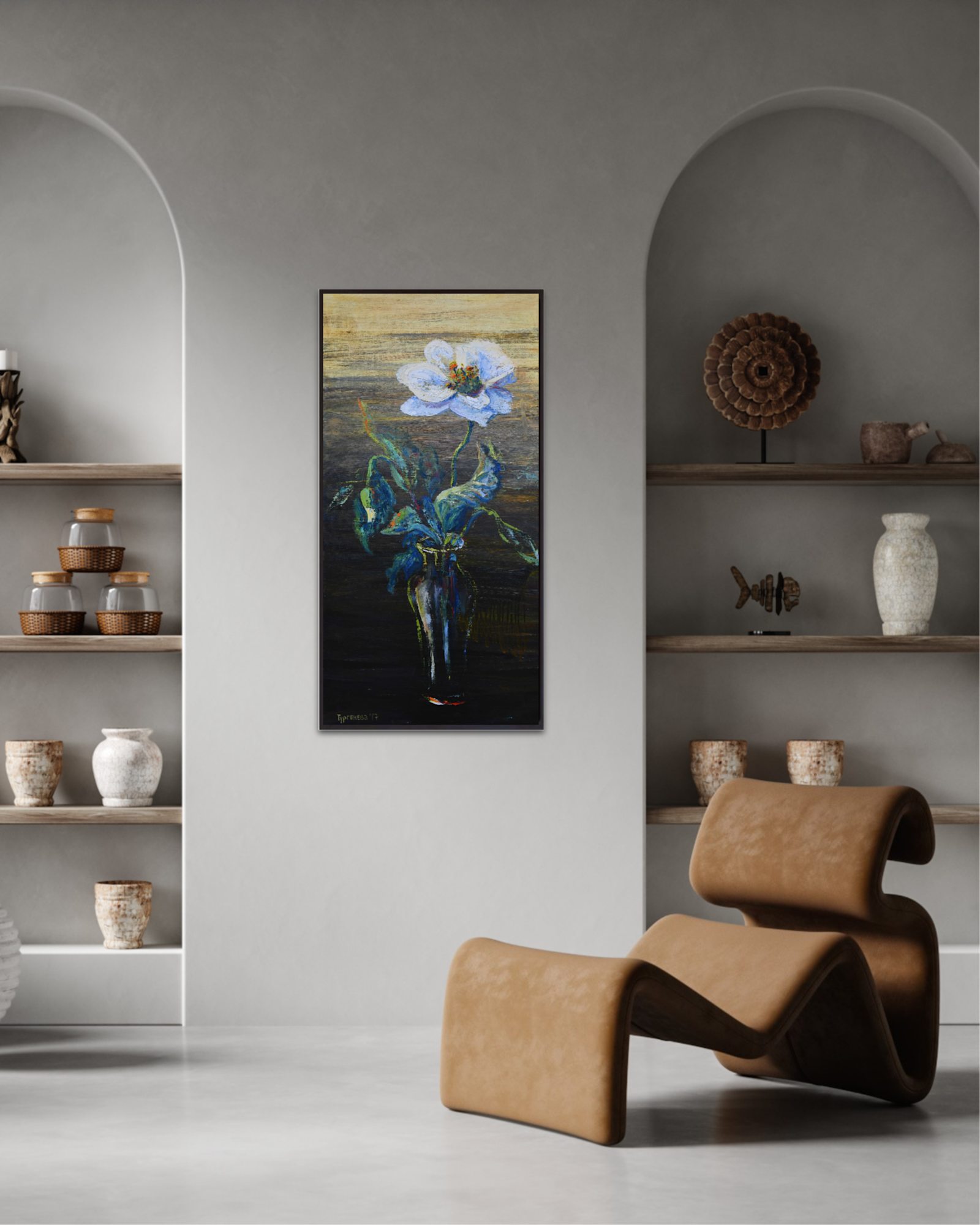 This picture presents a delicate white poppy flower in a transparent vase, depicted against a muted, atmospheric background. Its rich brushstrokes and textured layers evoke an impressionistic style, reminiscent of Monet's narrow, focused compositions. The play of light and shadow highlights the intricate details of the petals and leaves, while the dark backdrop accentuates the flower’s luminous quality.