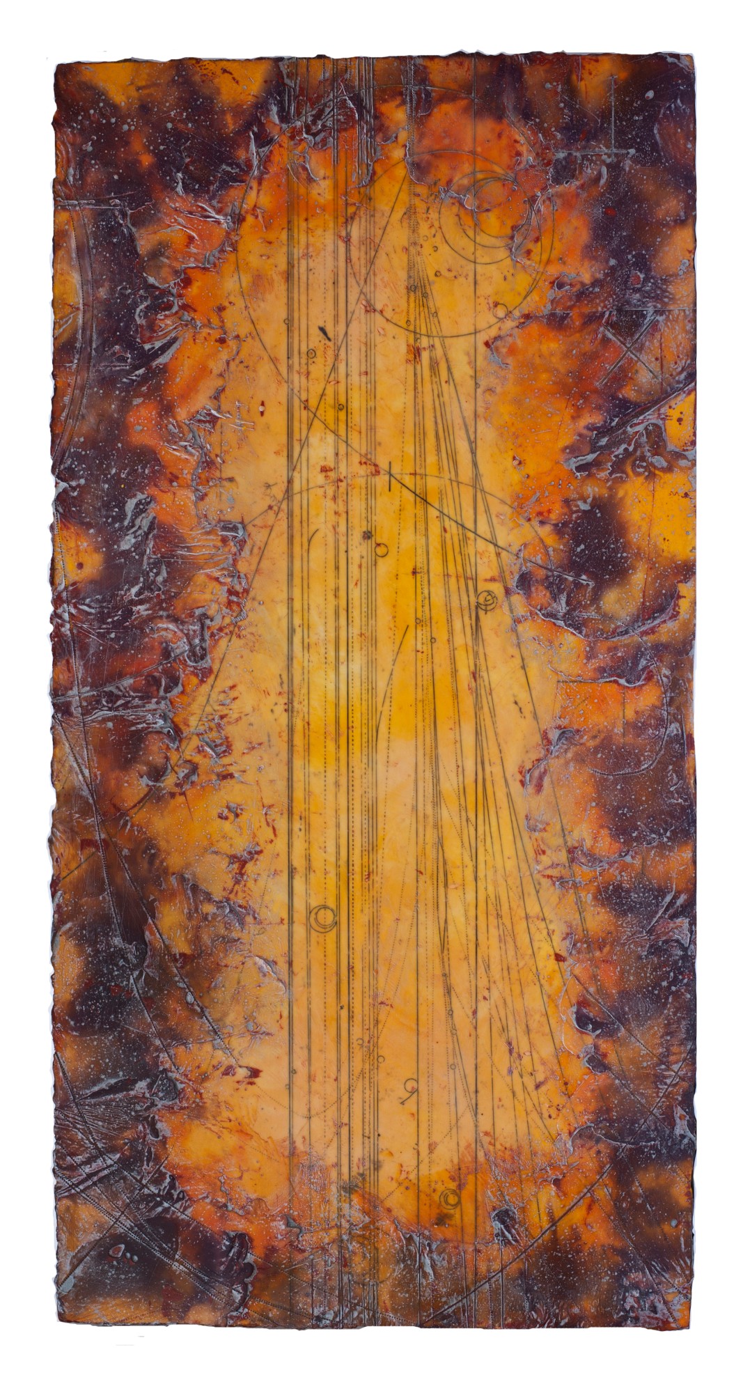This piece was inspired by particle movement within a bubble chamber. Pictures of the many trails and patterns of the particles were captured in the book "Particle Explosion". This piece is based on a specific image in that book that captivated my attention. There is also a series of prints based on this piece called "Collision Transit Studies"