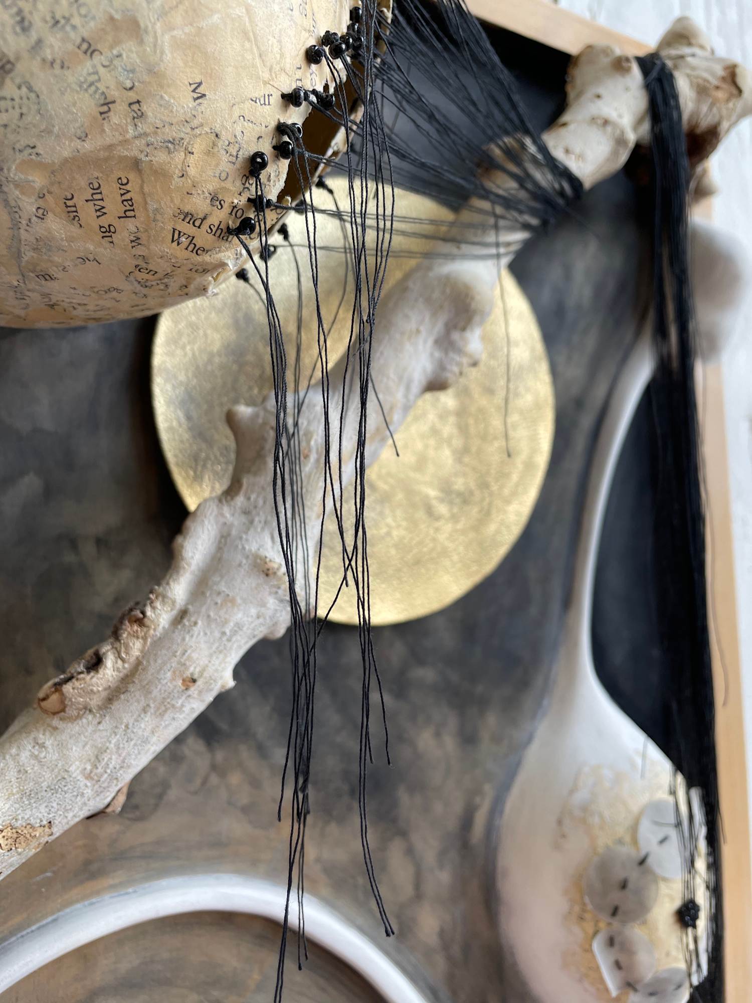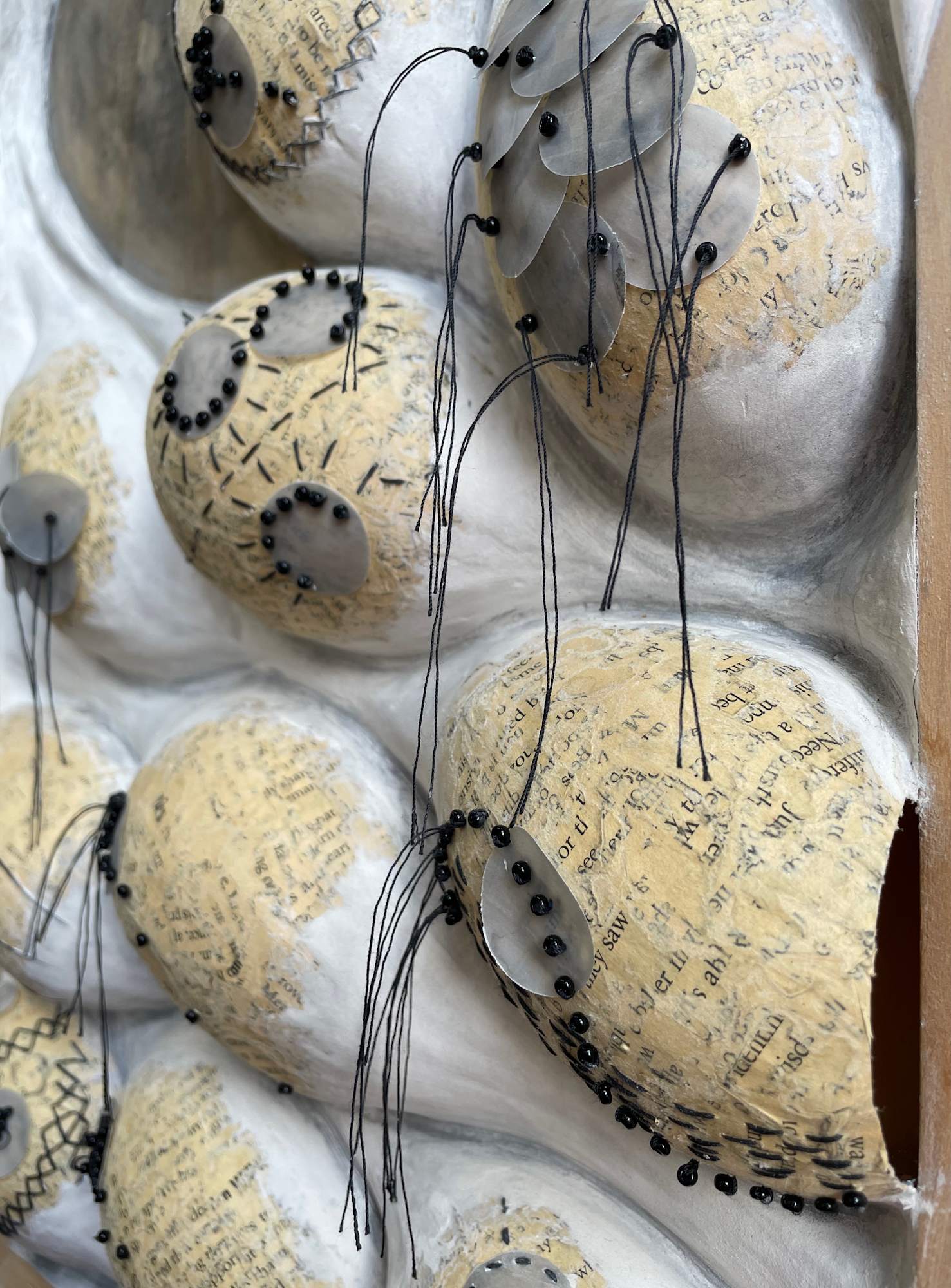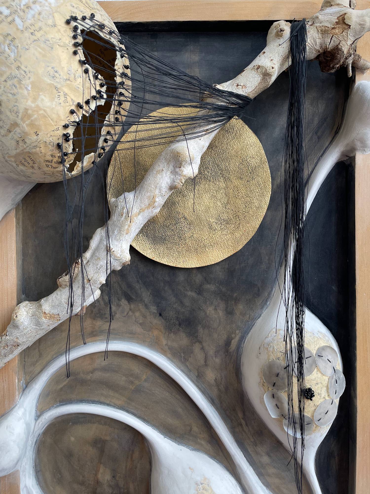 Wood, paper mâché, paper clay, thread, glass beads, vellum, watercolor paper, acrylic paint, gold leaf