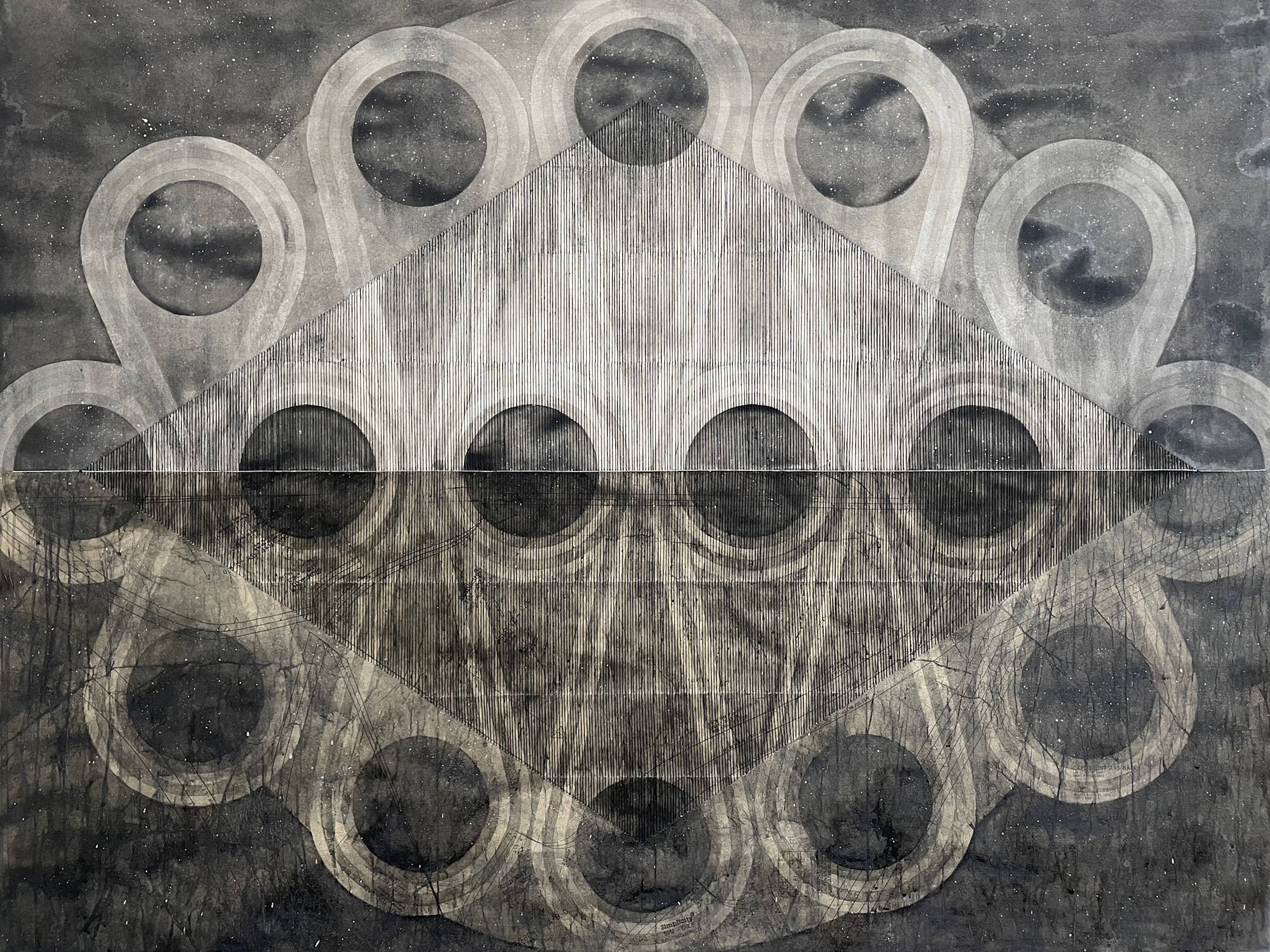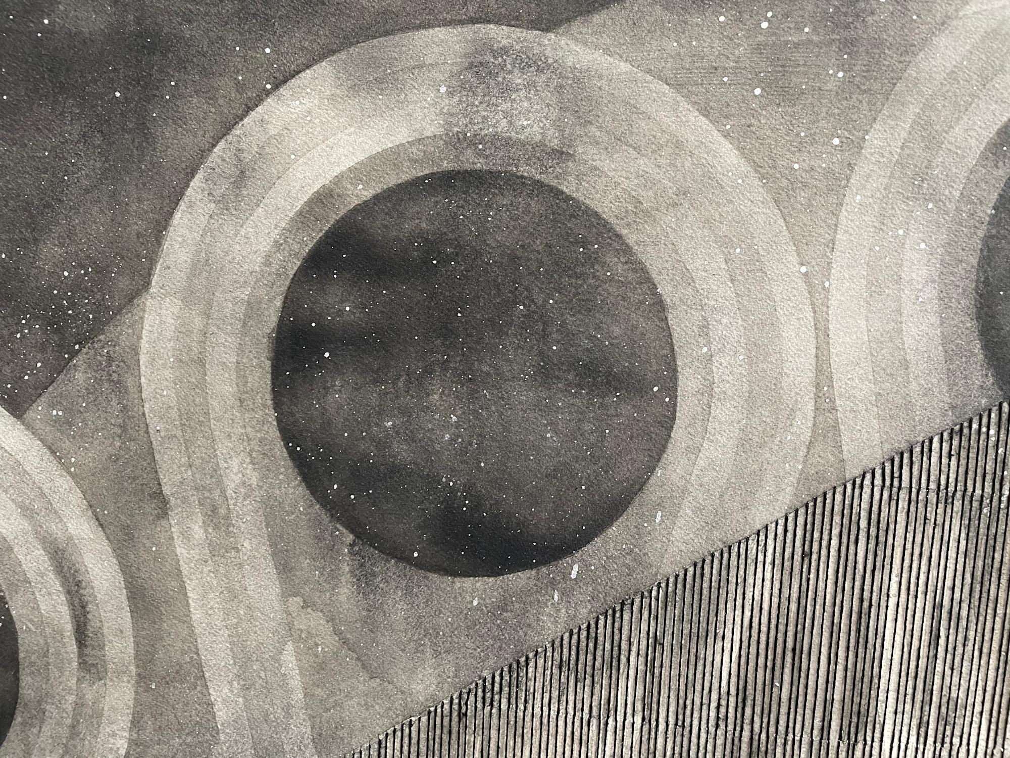 On November 6, 2024, Kamala Harris referenced this adage in her presidential concession speech, “only when it is dark enough, you can see the stars”. That adage formed an image in my mind of a vast landscape: an endless dark sky mirrored by uninterrupted black water, the dim light of stars cast upon the whirling eternal universe. I’ve never wished for brightness more than in that moment. My only hope is that there are enough brave people in the world to provide the light and energy needed to guide us to a brighter future. This painting is the embodiment of that hope.
