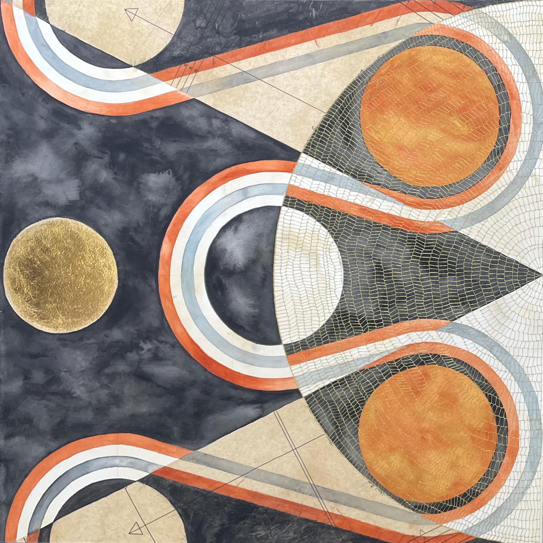 Watercolor on paper, string, gold leaf, sewing pattern, wood
